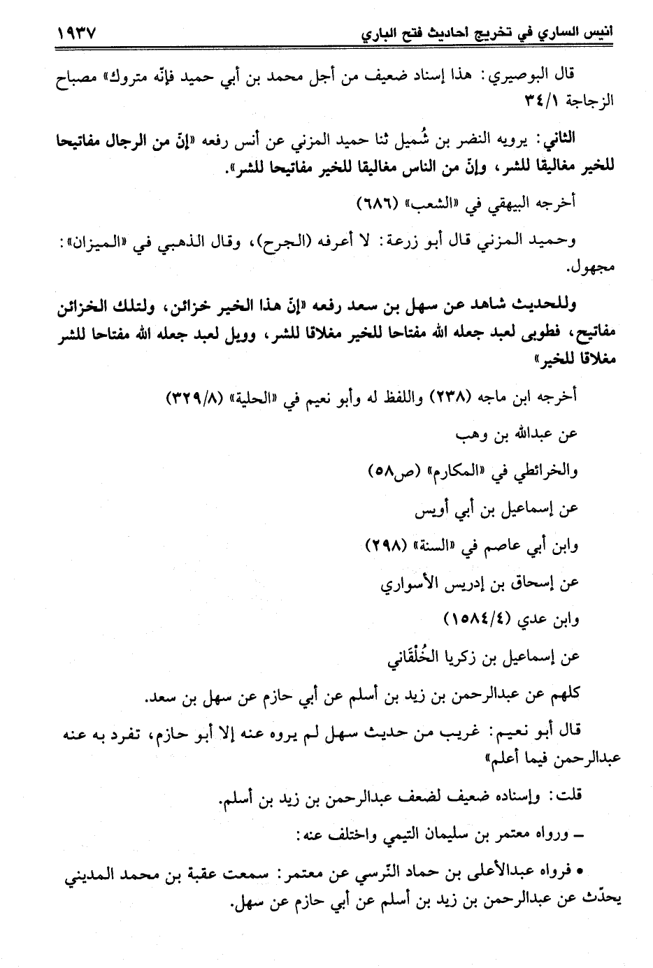 الثاني: يرويه النضر بن شُميل ثنا حميد المزني عن أنس رفعه "إنّ من الرجال مفاتيحا للخير مغاليقا للشر، وإنّ من الناس مغاليقا للخير مفاتيحا للشر".