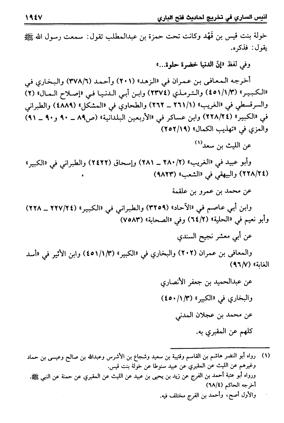 (¬1) رواه أبو النضر هاشم بن القاسم وقتيبة بن سعيد وشجاع بن الأشرس وعبد الله بن صالح وعيسى بن حماد وغيرهم عن الليث عن المقبري عن عبيد سنوطا عن خولة بنت قيس.