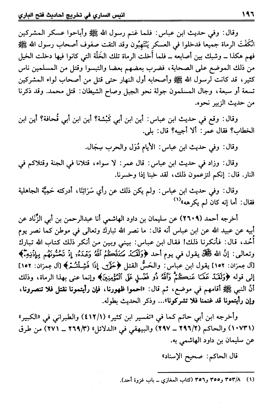 أخرجه أحمد (2609) عن سليمان بن داود الهاشمي أنا عبد الرحمن بن أبي الزِّنَاد عن أبيه عن عبيد الله عن ابن عباس أنه قال: ما نصر الله تبارك وتعالى في موطن كما نصر يوم أُحُد، قال: فأنكرنا ذلك! فقال ابن عباس: بيني وبين من أنكر ذلك كتاب الله تبارك وتعالى: إن الله -عز وجل- يقول في يوم أحد {وَلَقَدْ صَدَقَكُمُ اللَّهُ وَعْدَهُ إِذْ تَحُسُّونَهُمْ بِإِذْنِهِ} [آل عمران: 152] يقول ابن عباس: والحَسُّ القتل {حَتَّى إِذَا فَشِلْتُمْ} [آل عمران: 152] إلى قوله {وَلَقَدْ عَفَا عَنْكُمْ وَاللَّهُ ذُو فَضْلٍ عَلَى الْمُؤْمِنِينَ} وإنما عني بهذا الرماة، وذلك أنّ النبي - صلى الله عليه وسلم - أقامهم في موضع، ثم قال: "احموا ظهورنا، فإن رأيتمونا نقتل فلا تنصرونا، وان رأيتمونا قد غنمنا فلا تشركونا" ... وذكر الحديث بطوله.