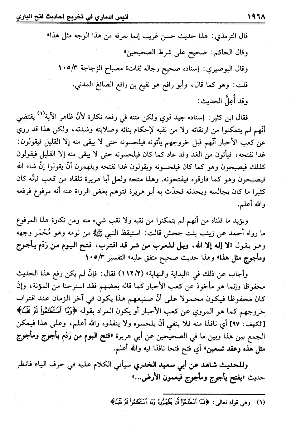 فقال ابن كثير: إسناده جيد قوي ولكن متنه في رفعه نكارة لأنّ ظاهر الآية (¬1) يقتضي أنّهم لم يتمكنوا من ارتقائه ولا من نقبه لإحكام بنائه وصلابته وشدته، ولكن هذا قد روي عن كعب الأحبار أنّهم قبل خروجهم يأتونه فيلحسونه حتى لا يبقى منه إلا القليل فيقولون: غدا نفتحه، فيأتون من الغد وقد عاد كما كان فيلحسونه حتى لا يبقى منه إلا القليل فيقولون كذلك فيصبحون وهو كما كان فيلحسونه ويقولون غدا نفتحه ويلهمون أنْ يقولوا إنْ شاء الله فيصبحون وهو كما فارقوه فيفتحونه. وهذا متجه ولعل أبا هريرة تلقاه من كعب فإنّه كان كثيرا ما كان يجالسه ويحدثه فحدّث به أبو هريرة فتوهم بعض الرواة عنه أنه مرفوع فرفعه والله أعلم.
