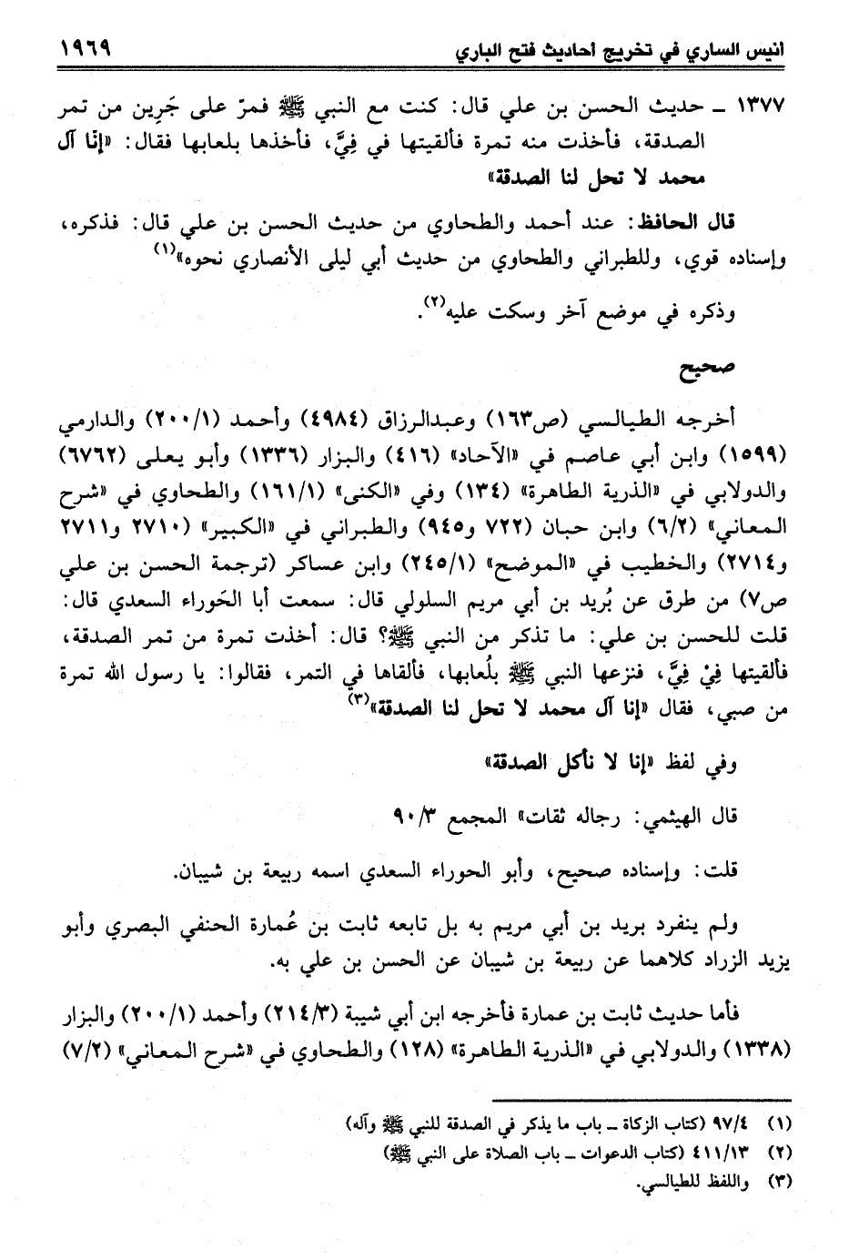 أخرجه الطيالسي (ص 163) وعبد الرزاق (4984) وأحمد (1/ 200) والدارمي (1599) وابن أبي عاصم في "الآحاد" (416) والبزار (1336) وأبو يعلى (6762) والدولابي في "الذرية الطاهرة" (134) وفي "الكنى" (1/ 161) والطحاوي في "شرح المعاني" (2/ 6) وابن حبان (722 و 945) والطبراني في "الكبير" (2710 و 2711 و2714) والخطيب في "الموضح" (1/ 245) وابن عساكر (ترجمة الحسن بن علي ص 7) من طرق عن بُريد بن أبي مريم السلولي قال: سمعت أبا الحَوراء السعدي قال: قلت للحسن بن علي: ما تذكر من النبي - صلى الله عليه وسلم -؟ قال: أخذت تمرة من تمر الصدقة، فألقيتها فِيْ فِيَّ، فنزعها النبي - صلى الله عليه وسلم - بلُعابها، فألقاها في التمر، فقالوا: يا رسول الله تمرة من صبي، فقال "إنا آل محمد لا تحل لنا الصدقة" (¬3)