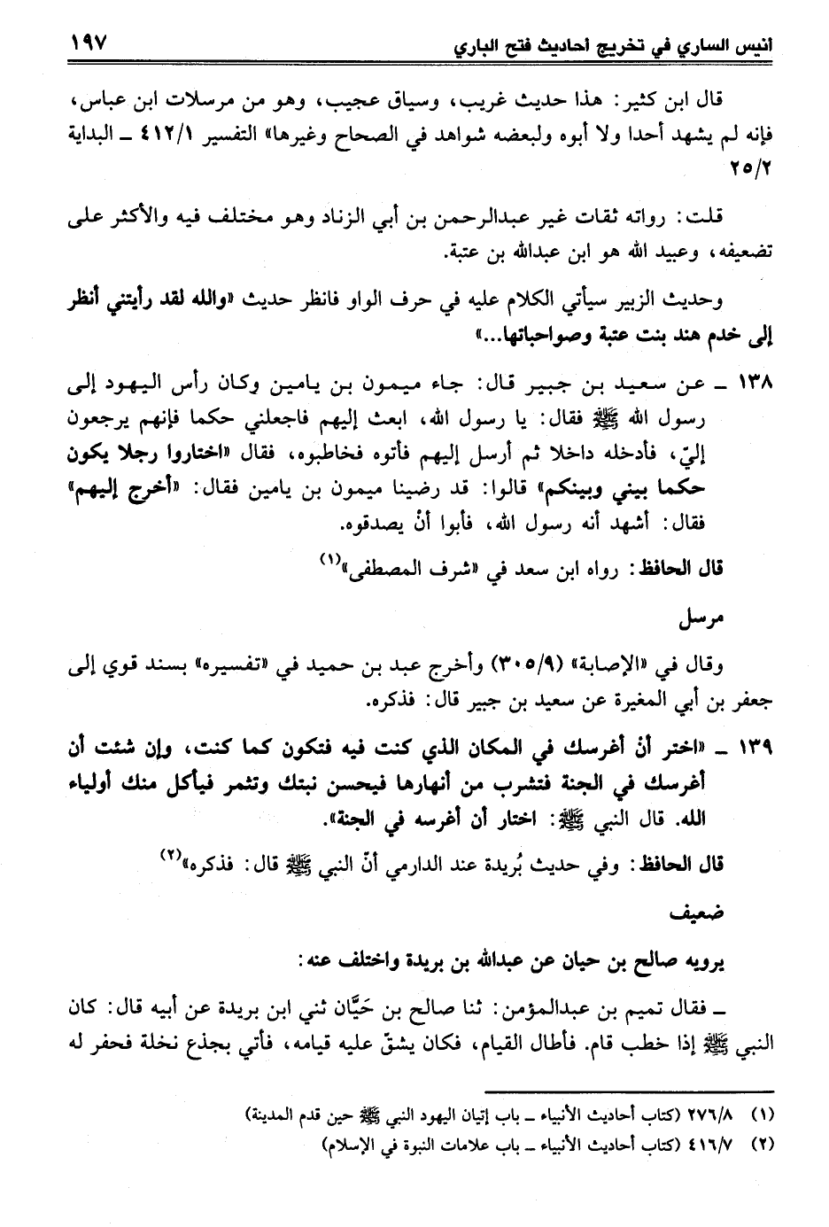 138 - عن سعيد بن جبير قال: جاء ميمون بن يامين وكان رأس اليهود إلى رسول الله - صلى الله عليه وسلم - فقال: يا رسول الله، ابعث إليهم فاجعلني حكما فإنهم يرجعون إليّ، فأدخله داخلا ثم أرسل إليهم فأتوه فخاطبوه، فقال "اختاروا رجلا يكون حكما بيني وبينكم" قالوا: قد رضينا ميمون بن يامين فقال: "أخرج إليهم" فقال: أشهد أنه رسول الله، فأبوا أنْ يصدقوه.
