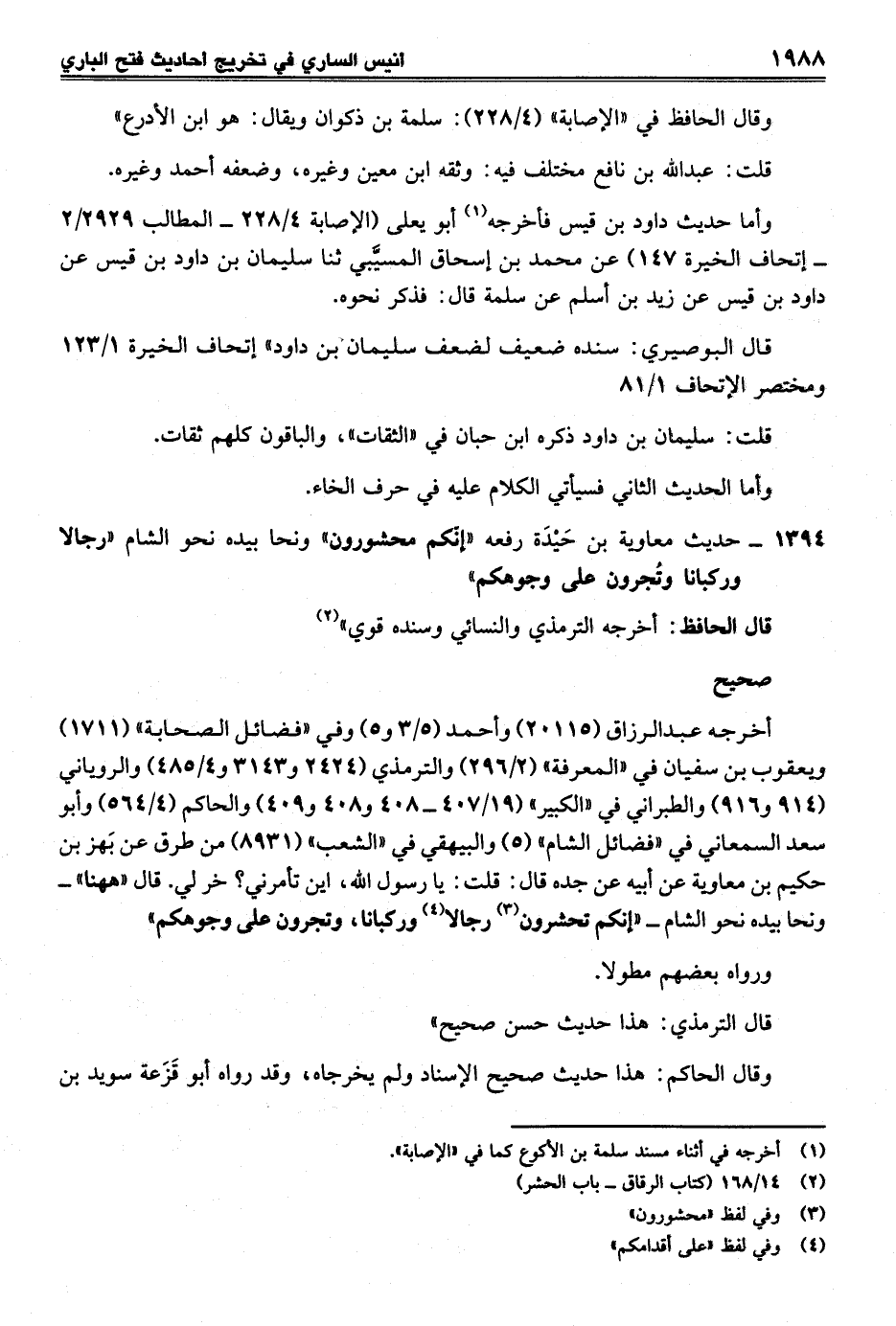 1394 - حديث معاوية بن حَيْدَة رفعه "إنّكم محشورون" ونحا بيده نحو الشام "رجالا وركبانا وتُجرون على وجوهكم"