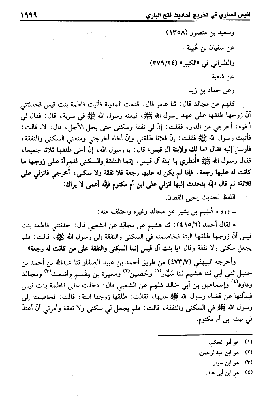 كلهم عن مجالد قال: ثنا عامر قال: قدمت المدينة فأتيت فاطمة بنت قيس فحدثتني أنّ زوجها طلقها على عهد رسول الله - صلى الله عليه وسلم -، فبعثه رسول الله - صلى الله عليه وسلم - في سرية، قال: فقال لي أخوه: أخرجي من الدار، فقلت: إنّ لي نفقة وسكنى حتى يحل الأجل، قال: لا. قالت: فأتيت رسول الله - صلى الله عليه وسلم - فقلت: إنّ فلانا طلقني وإنّ أخاه أخرجني ومنعني السكنى والنفقة، فأرسل إليه فقال "ما لك ولإبنة آل قيس" قال: يا رسول الله، إنّ أخي طلقها ثلاثا جميعا، فقال رسول الله - صلى الله عليه وسلم - "أُنظري يا ابنة آل قيس، إنما النفقة والسكنى للمرأة على زوجها ما كانت له عليها رجعة، فإذا لم يكن له عليها رجعة فلا نفقة ولا سكنى، أُخرجي فانزلي على فلانة" ثم قال "إنّه يتحدث إليها انزلي على ابن أم مكتوم فإنّه أعمى لا يراك"