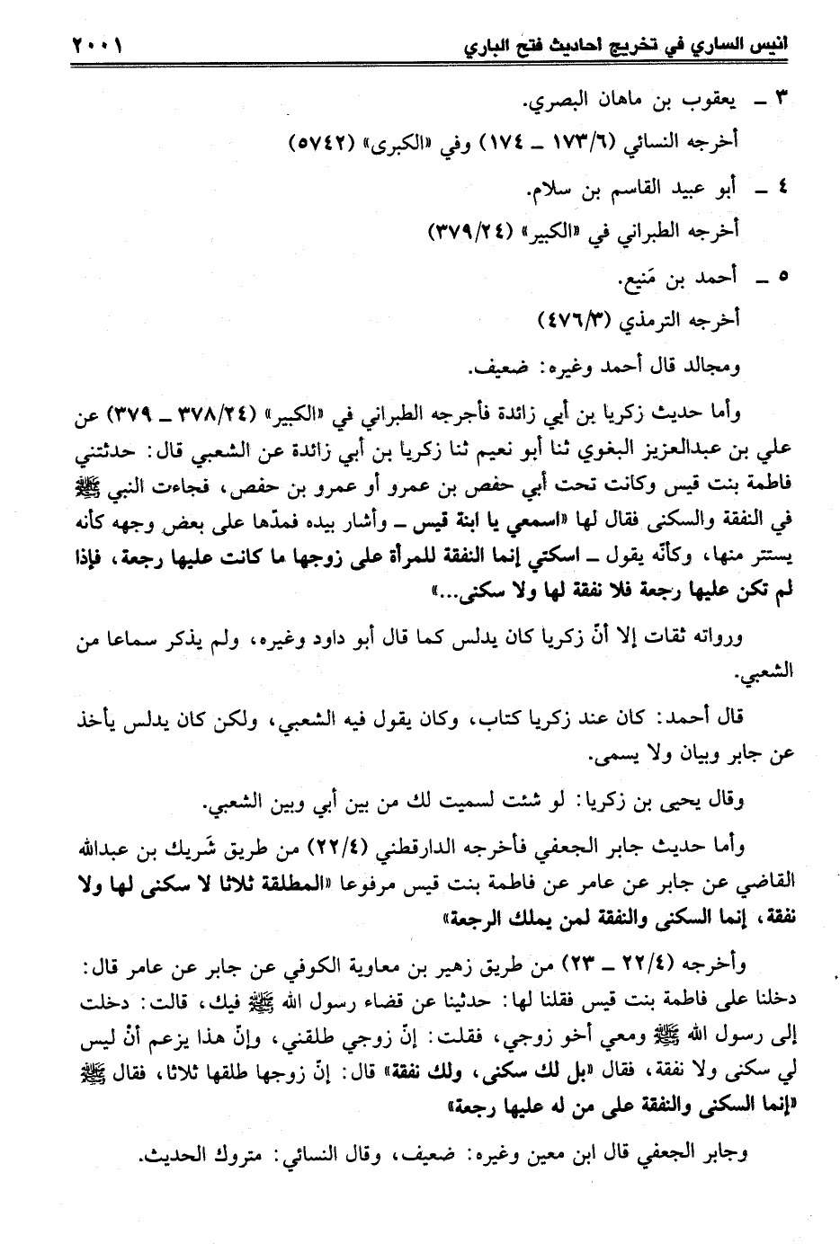 وأما حديث زكريا بن أبي زائدة فأخرجه الطبراني في "الكبير" (24/ 378 - 379) عن علي بن عبد العزيز البغوي ثنا أبو نعيم ثنا زكريا بن أبي زائدة عن الشعبي قال: حدثتني فاطمة بنت قيس وكانت تحت أبي حفص بن عمرو أو عمرو بن حفص، فجاءت النبي - صلى الله عليه وسلم - في النفقة والسكنى فقال لها "اسمعي يا ابنة قيس -وأشار بيده فمدّها على بعض جهه كأنه يستتر منها، وكأنّه يقول- اسكتي إنما النفقة للمرأة على زوجها ما كانت عليها رجعة، فإذا لم تكن عليها رجعة فلا نفقة لها ولا سكنى ... "