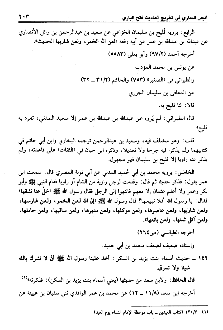 الرابع: يرويه فُليح بن سليمان الخزاعي عن سعيد بن عبد الرحمن بن وائل الأنصاري عن عبد الله بن عبد الله بن عمر عن أبيه رفعه "لعن الله الخمر، ولعن شاربها الحديث".
