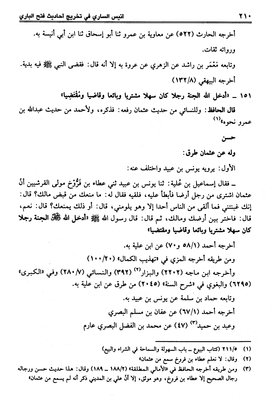 - فقال إسماعيل بن عُلية: ثنا يونس بن عبيد ثني عطاء بن فَرُّوْخ مولى القرشيين أنّ عثمان اشترى من رجل أرضا فأبطأ عليه، فلقيه فقال له: ما منعك من قبض مالك؟ قال: إنك غبنتني فما ألقى من الناس أحدا إلا وهو يلومني، قال: أو ذلك يمنعك؟ قال: نعم، قال: فاختر بين أرضك ومالك، ثم قال: قال رسول الله -صلى الله عليه وسلم- "أدخل الله -عز وجل- الجنة رجلا كان سهلا مشتريا وبائعا وقاضيا ومقتضيا"