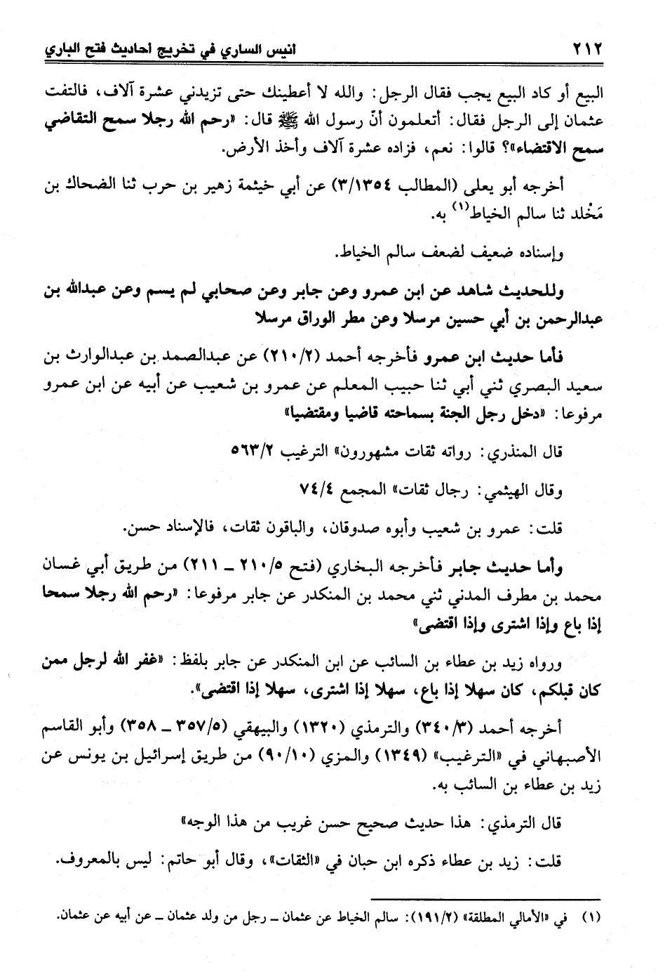 وأما حديث جابر فأخرجه البخاري (فتح 5/ 210 - 211) من طريق أبي غسان محمَّد بن مطرف المدني ثني محمَّد بن المنكدر عن جابر مرفوعا: "رحم الله رجلا سمحا إذا باع وإذا اشترى وإذا اقتضى"