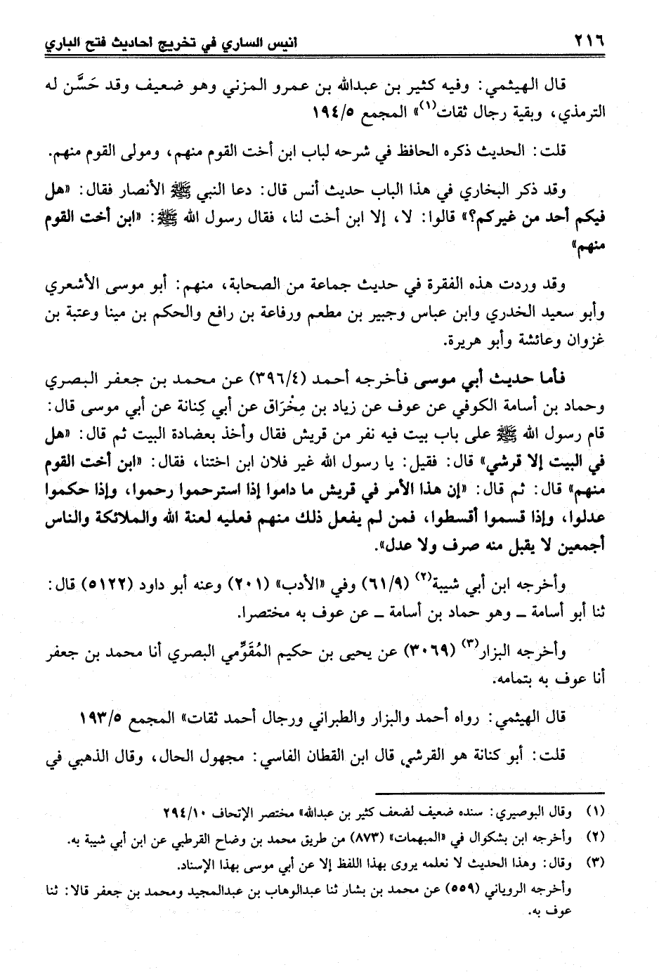 فأما حديث أبي موسى فأخرجه أحمد (4/ 396) عن محمَّد بن جعفر البصري وحماد بن أسامة الكوفي عن عوف عن زياد بن مِخْرَاق عن أبي كِنانة عن أبي موسى قال: قام رسول الله - صلى الله عليه وسلم - على باب بيت فيه نفر من قريش فقال وأخذ بعضادة البيت ثم قال: "هل في البيت إلا قرشي" قال: فقيل: يا رسول الله غير فلان ابن اختنا، فقال: "ابن أخت القوم منهم" قال: ثم قال: "إن هذا الأمر في قريش ما داموا إذا استرحموا رحموا، وإذا حكموا عدلوا، وإذا قسموا أقسطوا، فمن لم يفعل ذلك منهم فعليه لعنة الله والملائكة والناس أجمعين لا يقبل منه صرف ولا عدل".