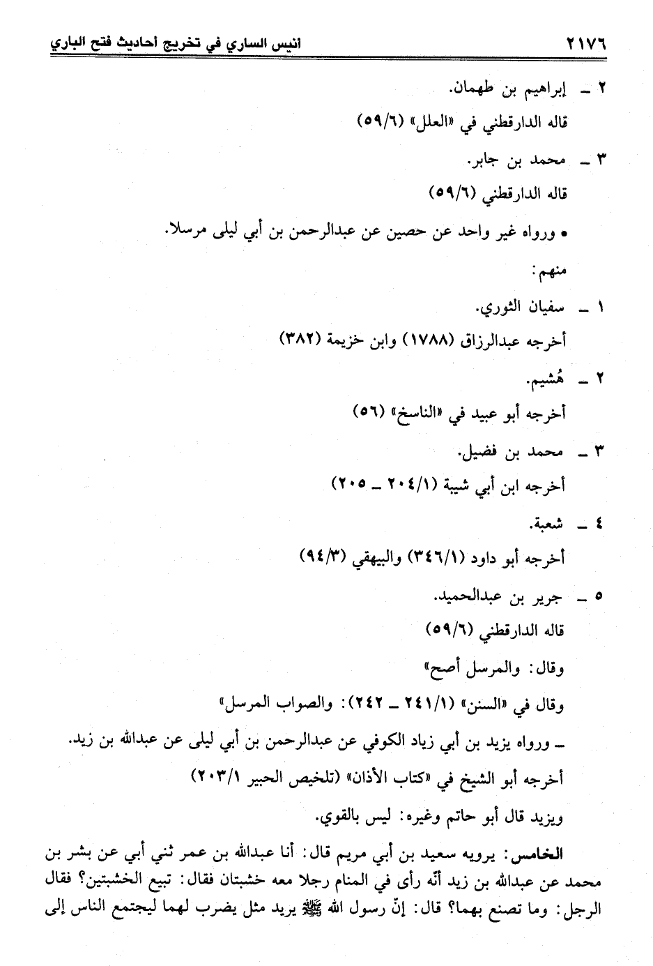 الخامس: يرويه سعيد بن أبي مريم قال: أنا عبد الله بن عمر ثني أبي عن بشر بن محمد عن عبد الله بن زيد أنه رأى في المنام رجلا معه خشبتان فقال: تبيع الخشبتين؟ فقال الرجل: وما تصنع بهما؟ قال: إن رسول الله - صلى الله عليه وسلم - يريد مثل يضرب لهما ليجتمع الناس إلى