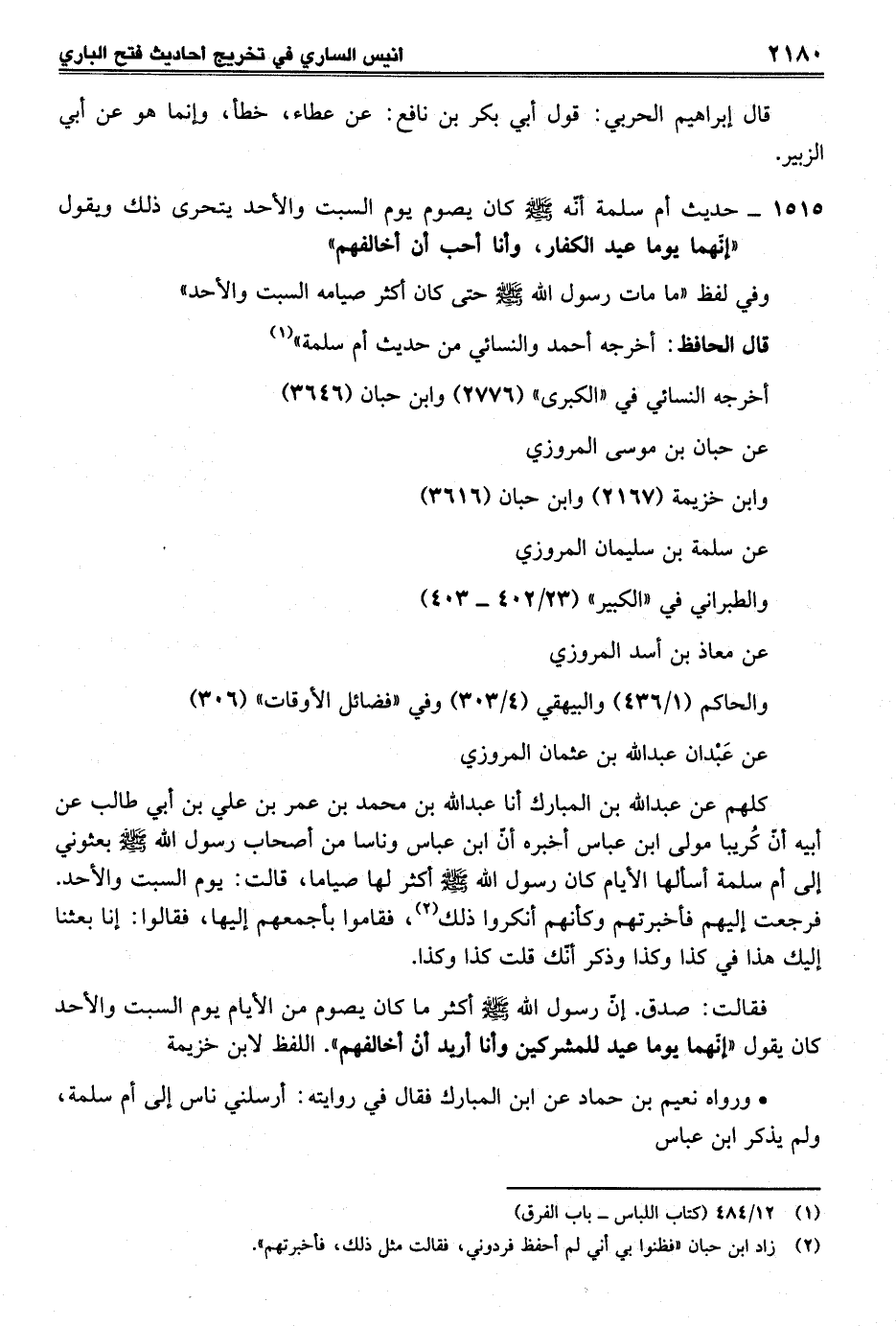 1515 - حديث أم سلمة أنّه - صلى الله عليه وسلم - كان يصوم يوم السبت والأحد يتحرى ذلك ويقول "إنّهما يوما عيد الكفار، وأنا أحب أن أخالفهم"