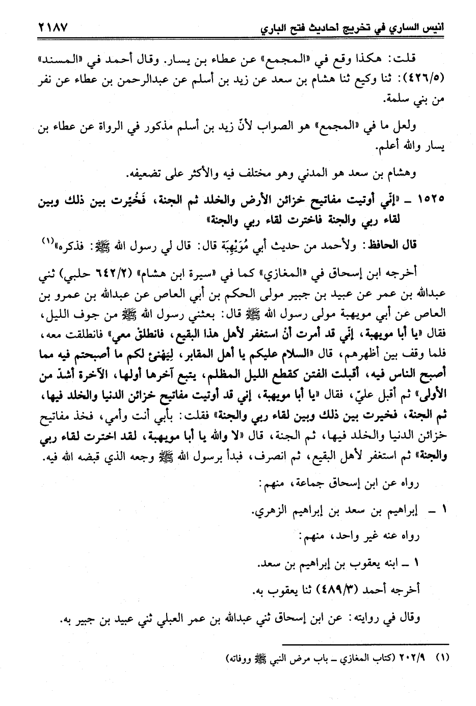 1525 - "إني أوتيت مفاتيح خزائن الأرض والخلد ثم الجنة، فَخُيِّرت بين ذلك وبين لقاء ربي والجنة فاخترت لقاء ربي والجنة"