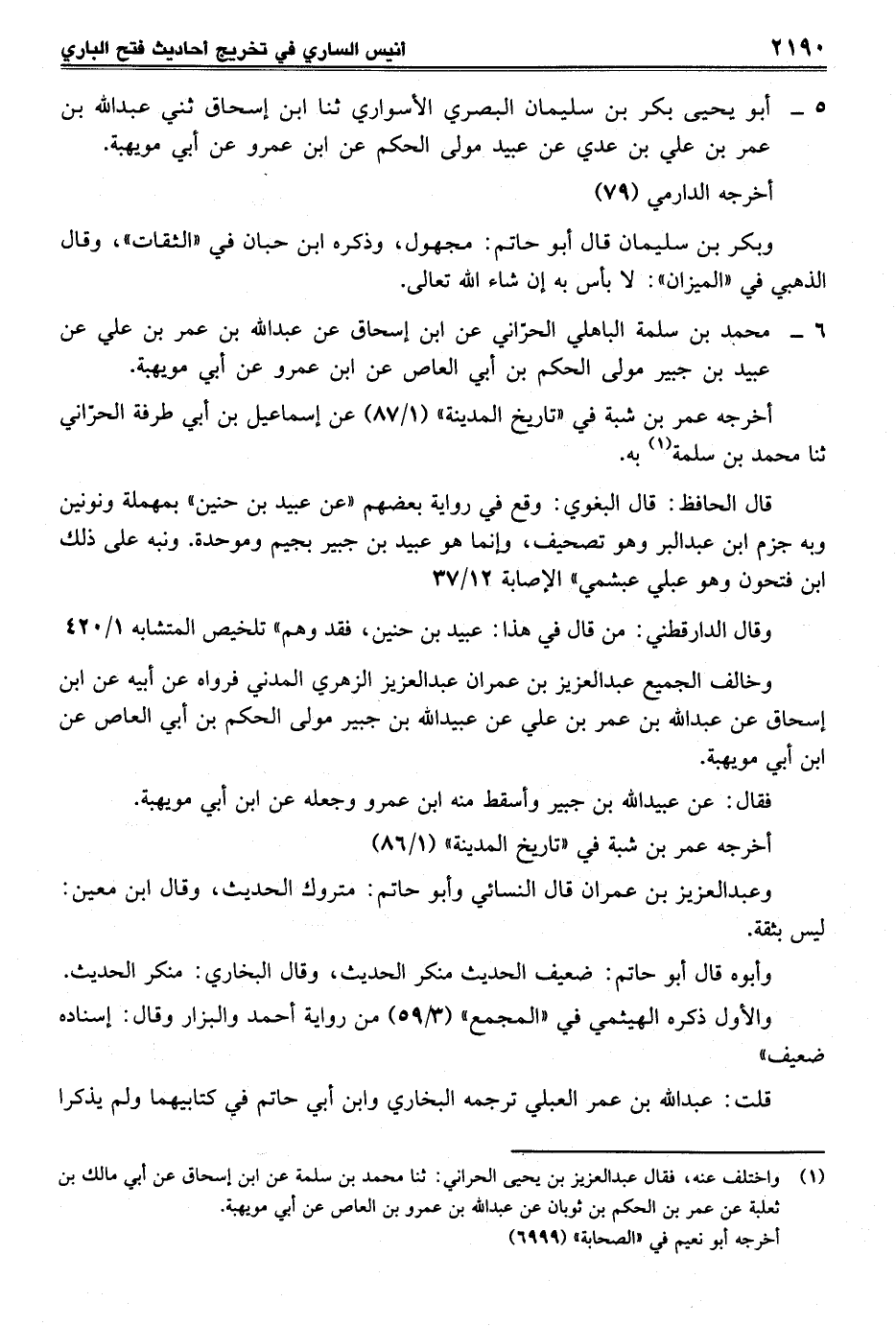 5 - أبو يحيى بكر بن سليمان البصري الأسواري ثنا ابن إسحاق ثني عبد الله بن عمر بن علي بن عدي عن عبيد مولى الحكم عن ابن عمرو عن أبي مويهبة.