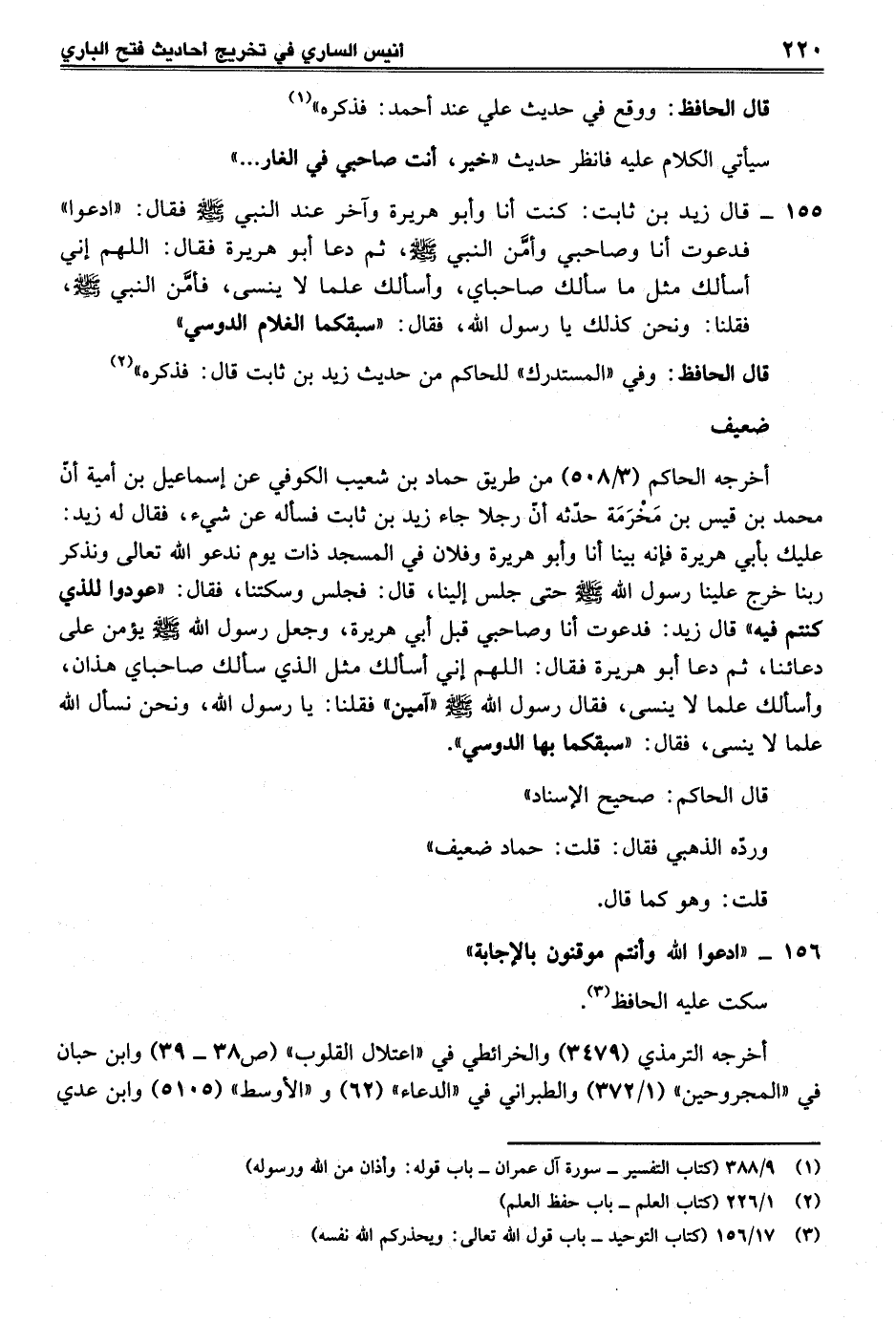 155 - قال زيد بن ثابت: كنت أنا وأبو هريرة وآخر عند النبي - صلى الله عليه وسلم - فقال: "ادعوا" فدعوت أنا وصاحبي وأمَّن النبي - صلى الله عليه وسلم -، ثم دعا أبو هريرة فقال: اللهم إني أسألك مثل ما سألك صاحباي، وأسألك علما لا ينسى، فأمَّن النبي - صلى الله عليه وسلم -، فقلنا: ونحن كذلك يا رسول الله، فقال: "سبقكما الغلام الدوسي"