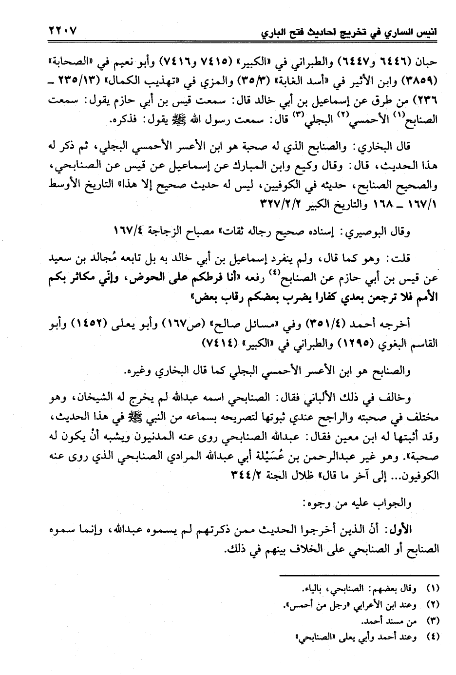 وخالف في ذلك الألباني فقال: الصنابحي اسمه عبد الله لم يخرج له الشيخان، وهو مختلف في صحبته والراجح عندي ثبوتها لتصريحه بسماعه من النبي - صلى الله عليه وسلم - في هذا الحديث، وقد أثبتها له ابن معين فقال: عبد الله الصنابحي روى عنه المدنيون ويشبه أنْ يكون له صحبة". وهو غير عبد الرحمن بن عُسَيْلة أبي عبد الله المرادي الصنابحي الذي روى عنه الكوفيون ... إلى آخر ما قال" ظلال الجنة 2/ 344