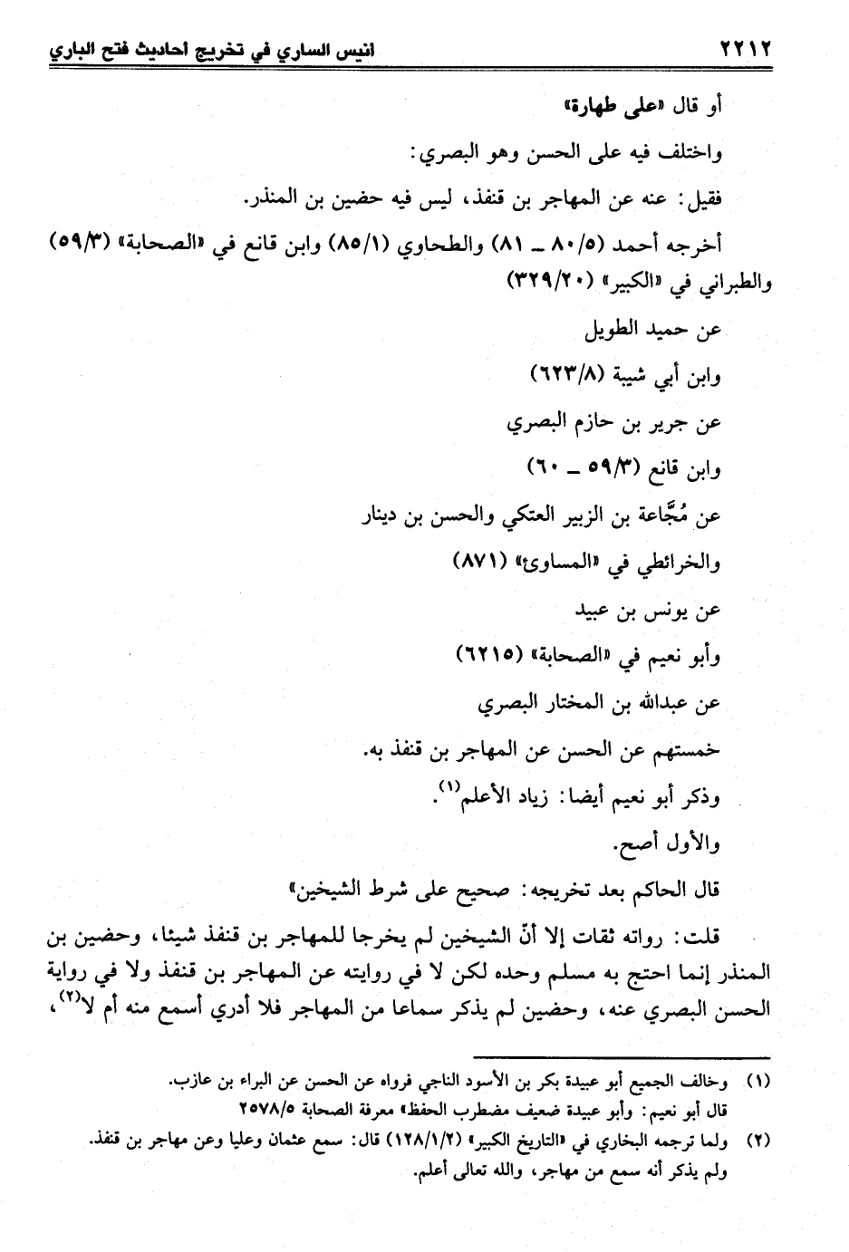 قلت: رواته ثقات إلا أنّ الشيخين لم يخرجا للمهاجر بن قنفذ شيئا، وحضين بن المنذر إنما احتج به مسلم وحده لكن لا في روايته عن المهاجر بن قنفذ ولا في رواية الحسن البصري عنه، وحضين لم يذكر سماعا من المهاجر فلا أدري أسمع منه أم لا (¬2)،
