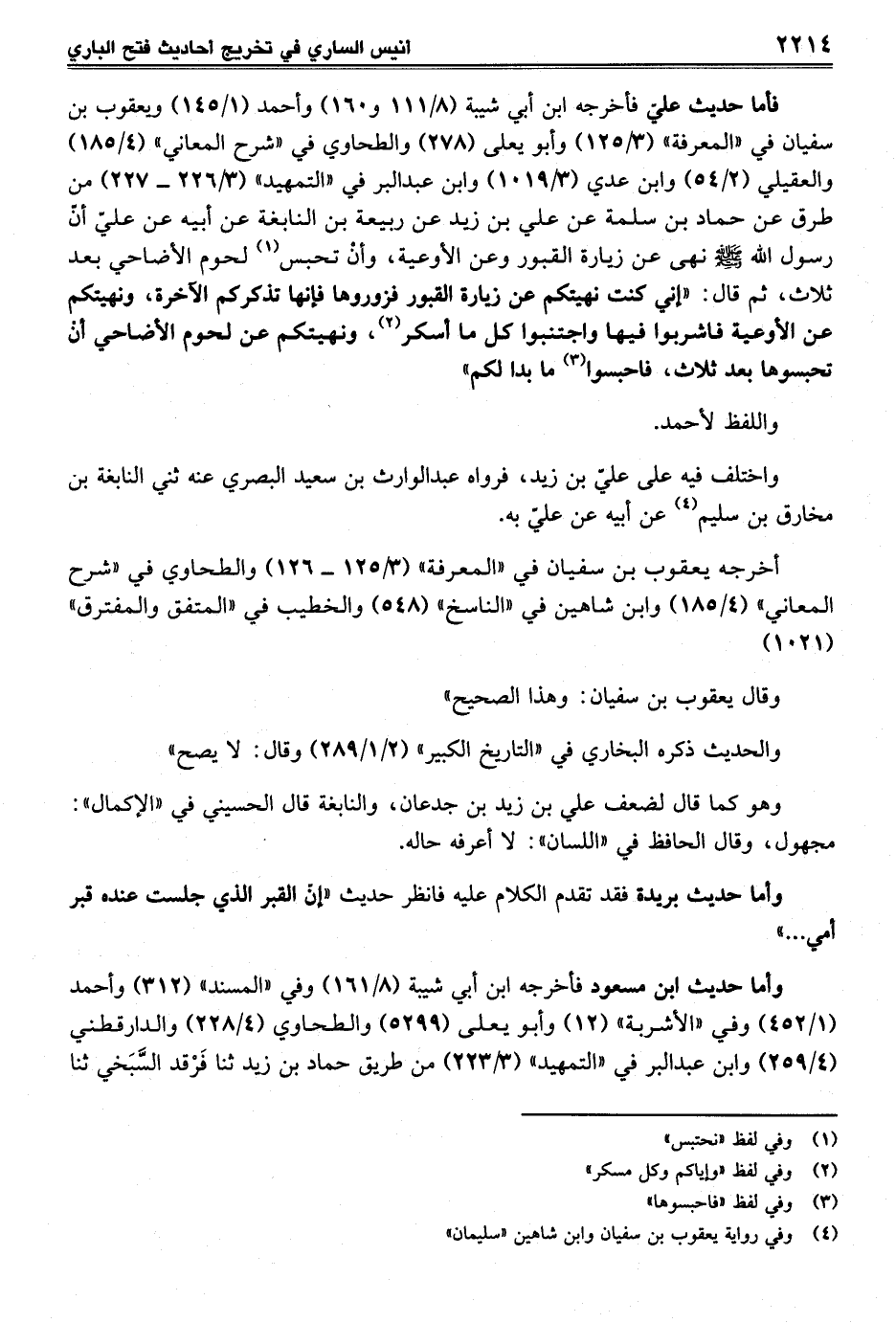 فأما حديث عليّ فأخرجه ابن أبي شيبة (8/ 111 و160) وأحمد (1/ 145) ويعقوب بن سفيان في "المعرفة" (3/ 125) وأبو يعلى (278) والطحاوي في "شرح المعاني" (4/ 185) والعقيلي (2/ 54) وابن عدي (3/ 1019) وابن عبد البر في "التمهيد" (3/ 226 - 227) من طرق عن حماد بن سلمة عن علي بن زيد عن ربيعة بن النابغة عن أبيه عن عليّ أنّ رسول الله - صلى الله عليه وسلم - نهى عن زيارة القبور وعن الأوعية، وأنْ تحبس (¬1) لحوم الأضاحي بعد ثلاث، ثم قال: "إني كنت نهيتكم عن زيارة القبور فزوروها فإنها تذكركم الآخرة، ونهيتكم عن الأوعية فاشربوا فيها واجتنبوا كل ما أسكر (¬2)، ونهيتكم عن لحوم الأضاحي أنْ تحبسوها بعد ثلاث، فاحبسوا (¬3) ما بدا لكم"