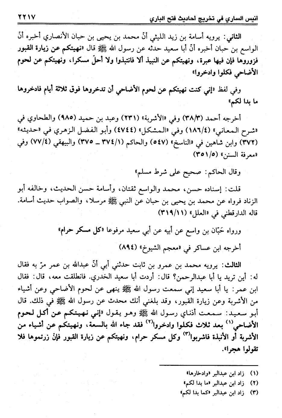 الثالث: يرويه محمد بن عمرو بن ثابت حدثني أبي أنّ عبد الله بن عمر مرّ به فقال له: أين تريد يا أبا عبد الرحمن؟ قال: أردت أبا سعيد الخدري. فانطلقت معه، قال: فقال ابن عمر: يا أبا سعيد إني سمعت رسول الله - صلى الله عليه وسلم - ينهى عن لحوم الأضاحي وعن أشياء من الأشربة وعن زيارة القبور، وقد بلغني أنك محدث عن رسول الله - صلى الله عليه وسلم - في ذلك. قال أبو سعيد: سمعت أذناي رسول الله - صلى الله عليه وسلم - وهو يقول "إني نهيتكم عن أكل لحوم الأضاحي (¬1) بعد ثلاث فكلوا وادخروا (¬2) فقد جاء الله بالسعة، ونهيتكم عن أشياء من الأشربة أو الأنبذة فاشربوا (¬3) وكل مسكر حرام، ونهيتكم عن زيارة القبور فإن زرتموها فلا تقولوا هجرا".