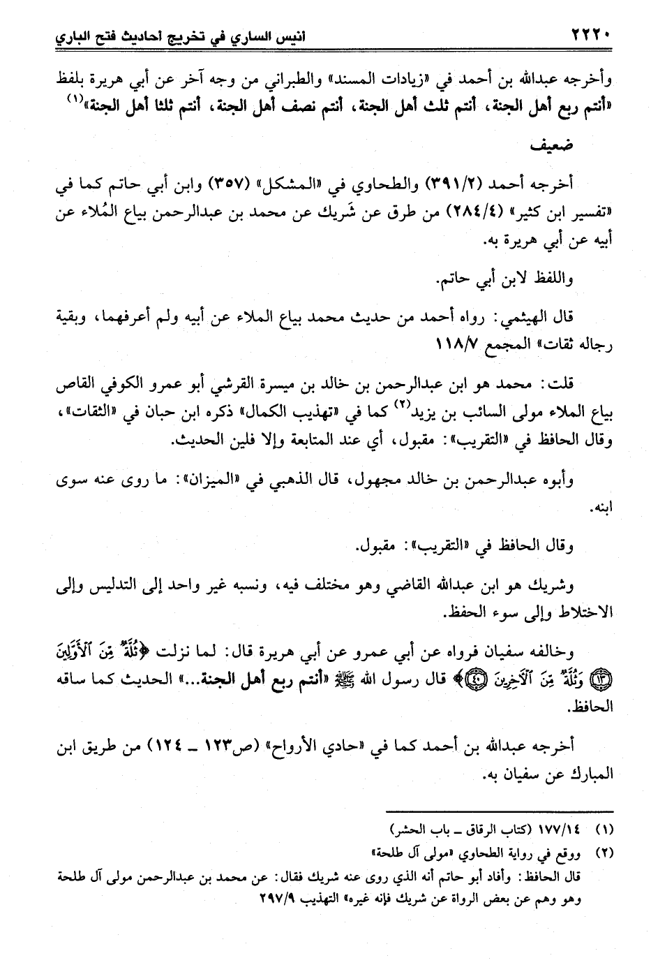 وأخرجه عبد الله بن أحمد في "زيادات المسند" والطبراني من وجه آخر عن أبي هريرة بلفظ "أنتم ربع أهل الجنة، أنتم ثلث أهل الجنة، أنتم نصف أهل الجنة، أنتم ثلثا أهل الجنة" (¬1)