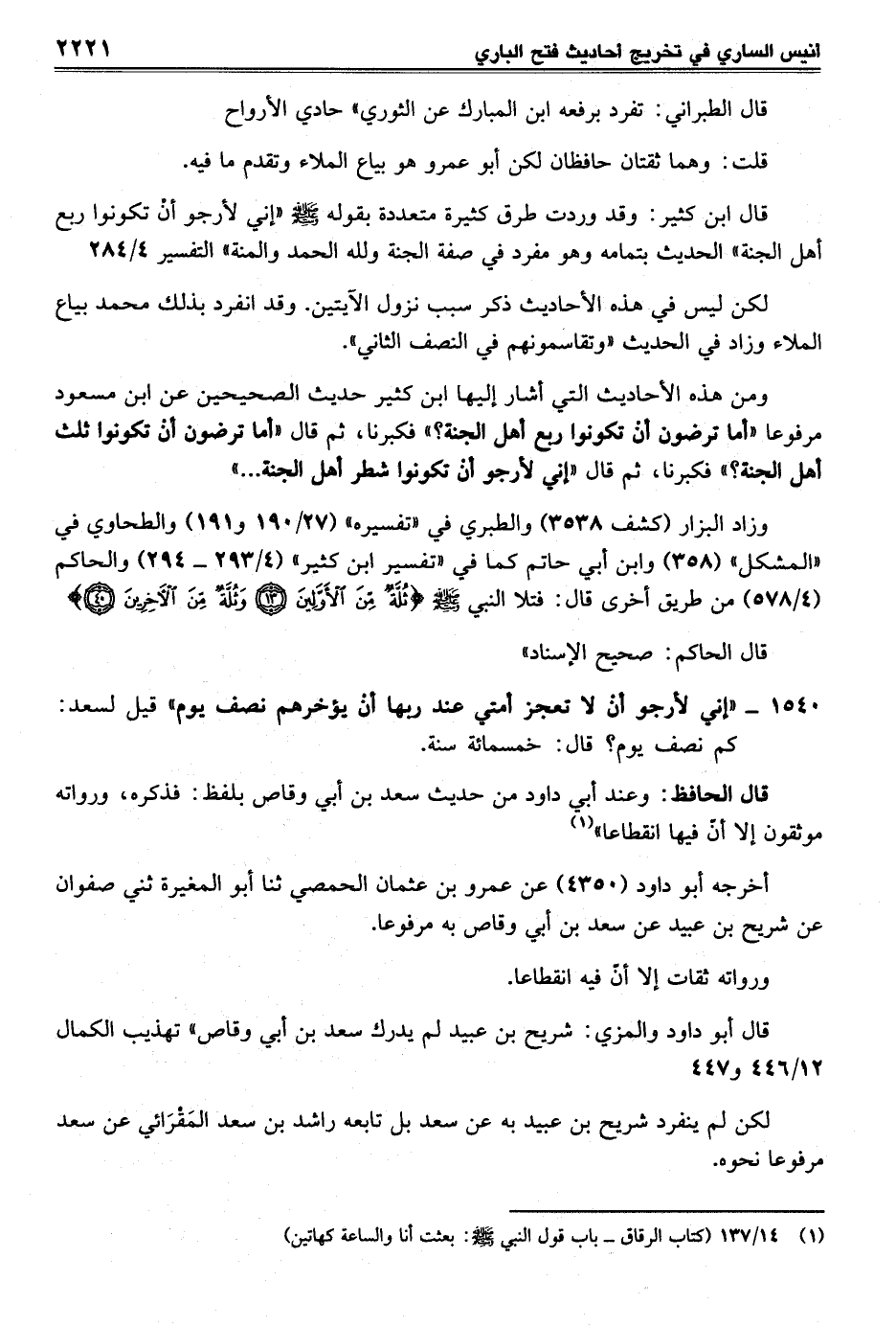 قال ابن كثير: وقد وردت طرق كثيرة متعددة بقوله - صلى الله عليه وسلم - "إني لأرجو أنْ تكونوا ربع أهل الجنة" الحديث بتمامه وهو مفرد في صفة الجنة ولله الحمد والمنة" التفسير 4/ 284