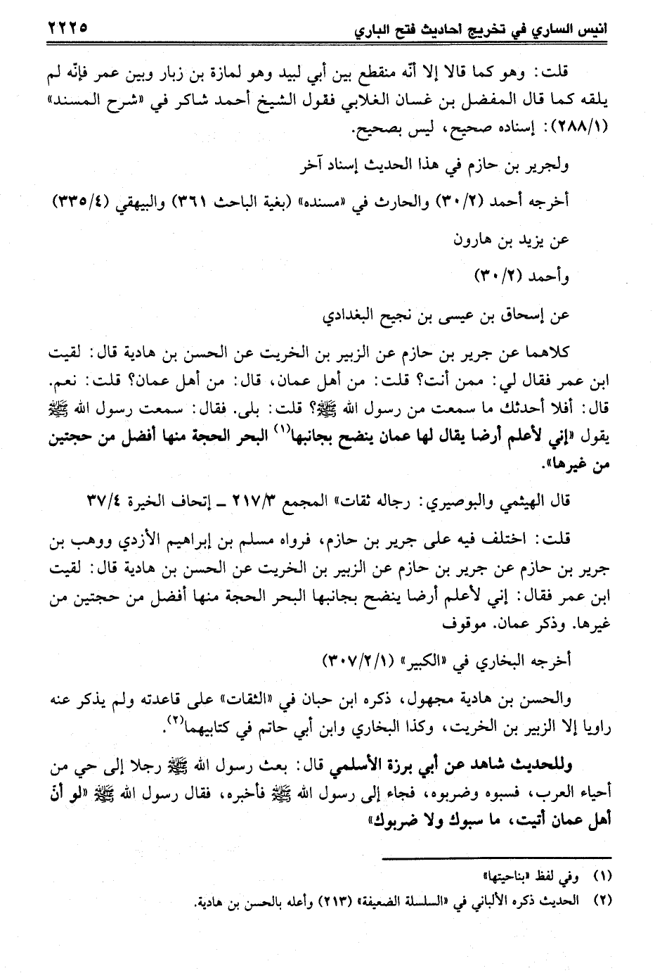 قلت: اختلف فيه على جرير بن حازم، فرواه مسلم بن إبراهيم الأزدي ووهب بن جرير بن حازم عن جرير بن حازم عن الزبير بن الخريت عن الحسن بن هادية قال: لقيت ابن عمر فقال: إني لأعلم أرضا ينضح بجانبها البحر الحجة منها أفضل من حجتين من غيرها. وذكر عمان. موقوف