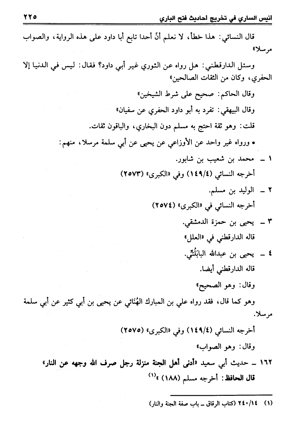 162 - حديث أبي سعيد "أدنى أهل الجنة منزلة رجل صرف الله وجهه عن النار" قال الحافظ: أخرجه مسلم (188) " (¬1)