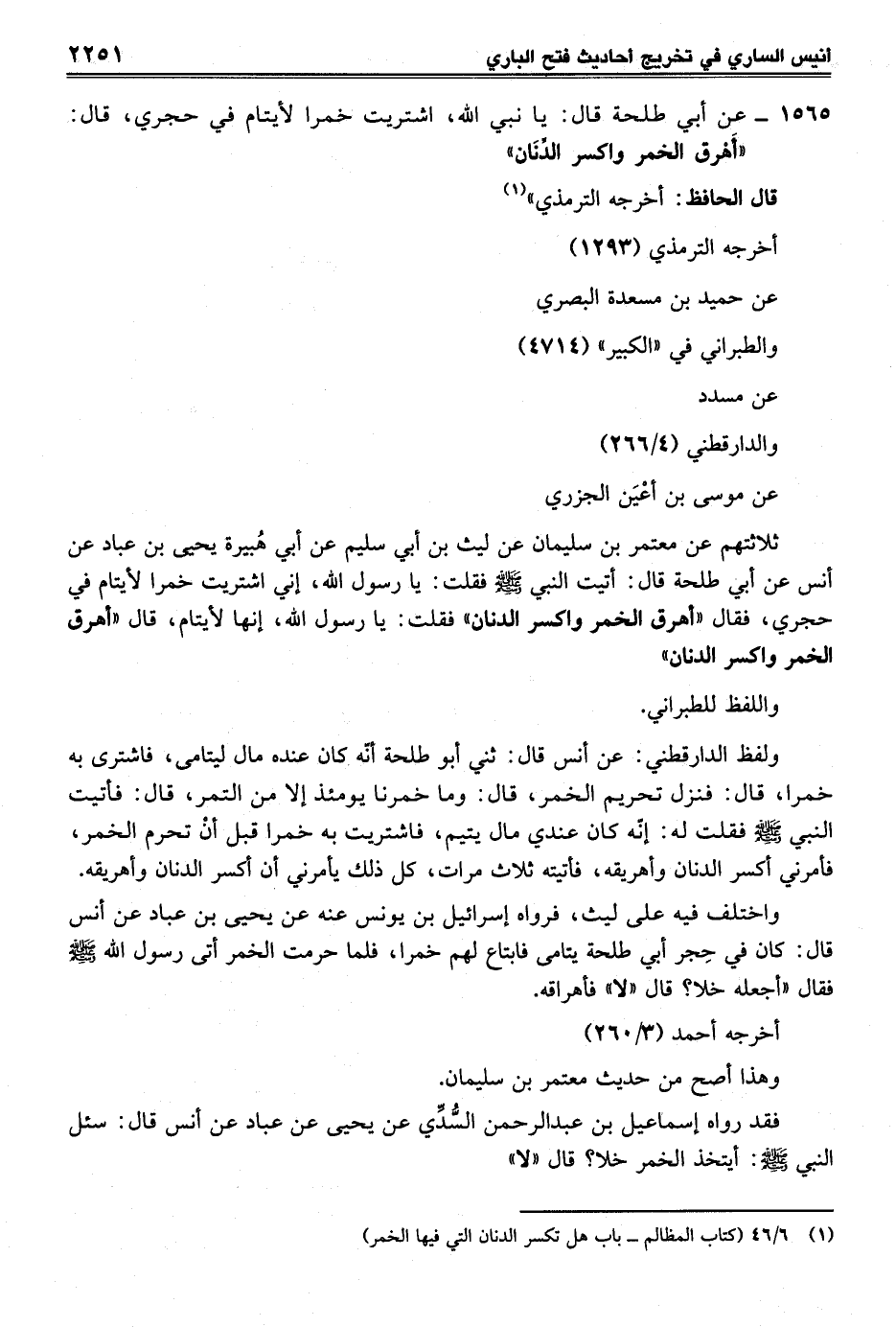 ولفظ الدارقطني: عن أنس قال: ثني أبو طلحة أنه كان عنده مال ليتامى، فاشترى به خمرا، قال: فنزل تحريم الخمر، قال: وما خمرنا يومئذ إلا من التمر، قال: فأتيت النبي - صلى الله عليه وسلم - فقلت له: إنّه كان عندي مال يتيم، فاشتريت به خمرا قبل أنْ تحرم الخمر، فأمرني أكسر الدنان وأهريقه، فأتيته ثلاث مرات، كل ذلك يأمرني أن كسر الدنان وأهريقه.