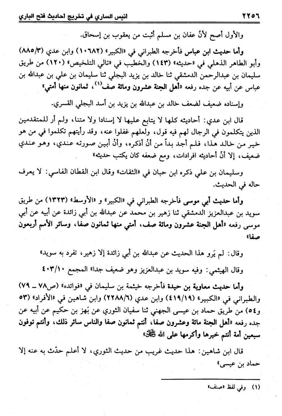 وأما حديث أبي موسى فأخرجه الطبراني في "الكبير" و"الأوسط" (1323) من طريق سويد بن عبد العزيز الدمشقي ثنا زهير بن محمد عن عبد الله بن أبي زائدة عن أبيه عن أبي موسى رفعه "أهل الجنة عشرون ومائة صف، أمتي منها ثمانون صفا، وسائر الأمم أربعون صفا"