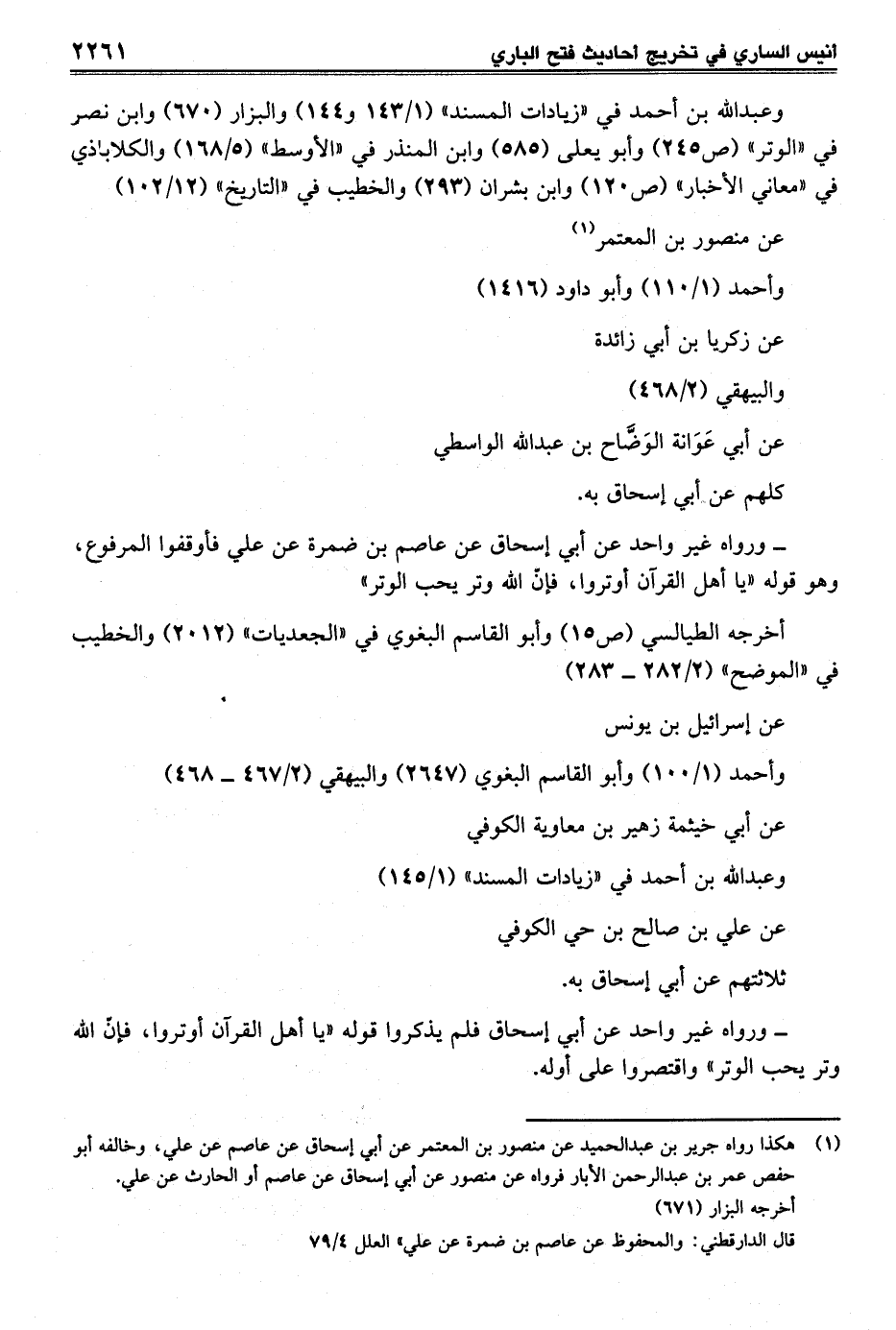 - ورواه غير واحد عن أبي إسحاق عن عاصم بن ضمرة عن علي فأوقفوا المرفوع، وهو قوله "يا أهل القرآن أوتروا، فإنّ الله وتر يحب الوتر"