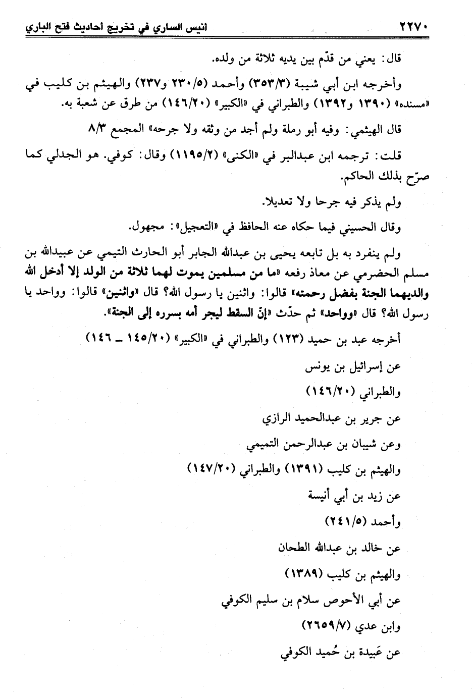 ولم ينفرد به بل تابعه يحيى بن عبد الله الجابر أبو الحارث التيمي عن عبيد الله بن مسلم الحضرمي عن معاذ رفعه "ما من مسلمين يموت لهما ثلاثة من الولد إلا أدخل الله والديهما الجنة بفضل رحمته" قالوا: واثنين يا رسول الله؟ قال "واثنين" قالوا: وواحد يا رسول الله؟ قال "وواحد" ثم حدّث "إنّ السقط ليجر أمه بسرره إلى الجنة".