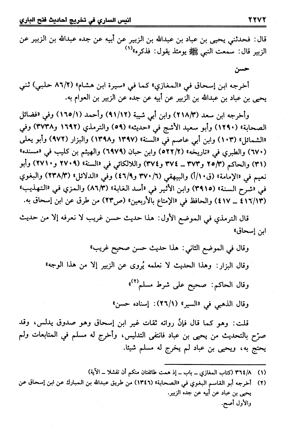 قلت: وهو كما قال فإنّ رواته ثقات غير ابن إسحاق وهو صدوق يدلس، وقد صرّح بالتحديث من يحيى بن عباد فانتفى التدليس، وأخرج له مسلم في المتابعات ولم يحتج به، ويحيى بن عباد لم يخرج له مسلم شيئا.