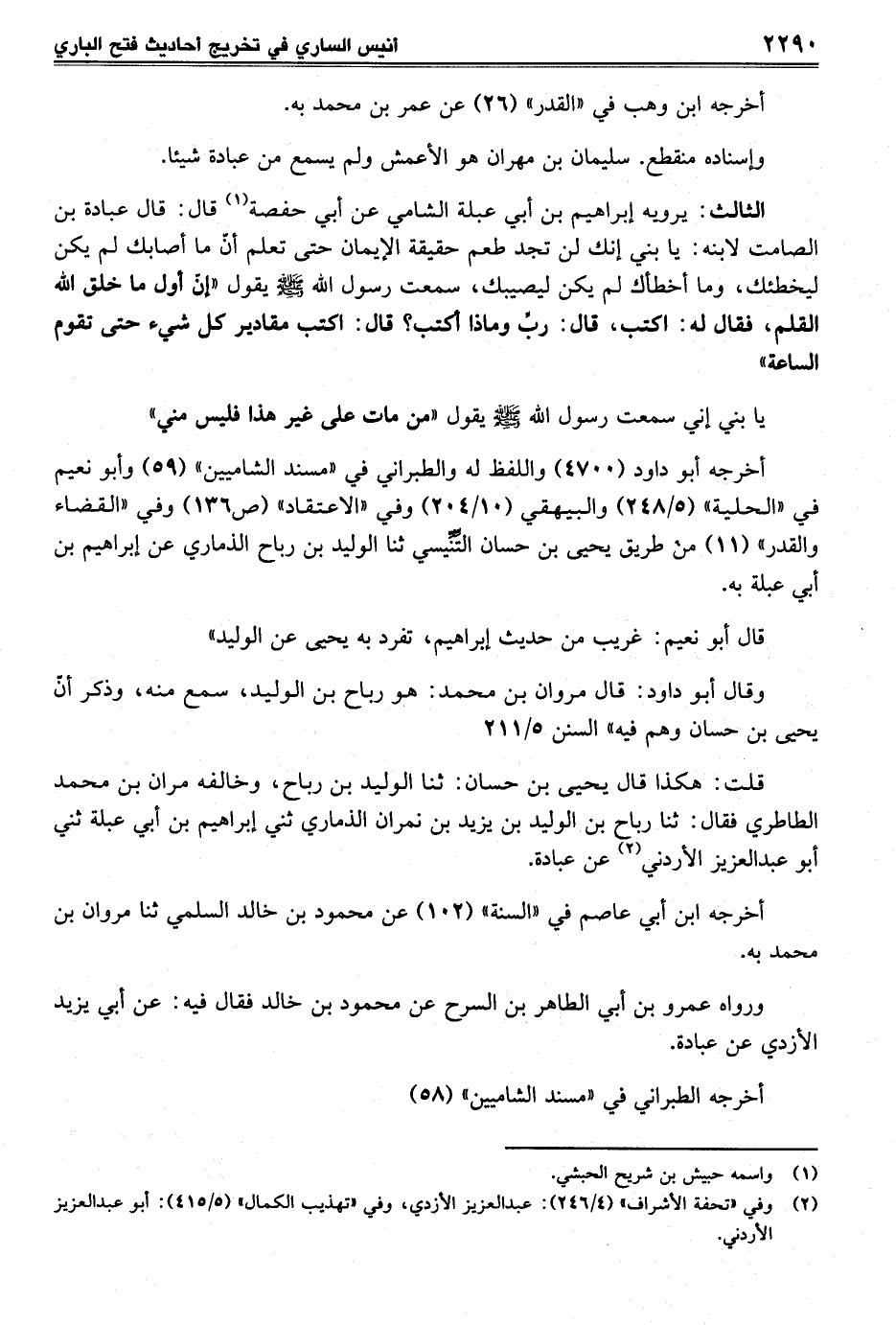 أخرجه أبو داود (4700) واللفظ له والطبراني في "مسند الشاميين" (59) وأبو نعيم في "الحلية " (5/ 248) والبيهقي (10/ 204) وفي "الاعتقاد" (ص 136) وفي "القضاء والقدر" (11) من طريق يحيى بن حسان التِّنِّيسي ثنا الوليد بن رباح الذماري عن إبراهيم بن أبي عبلة به.