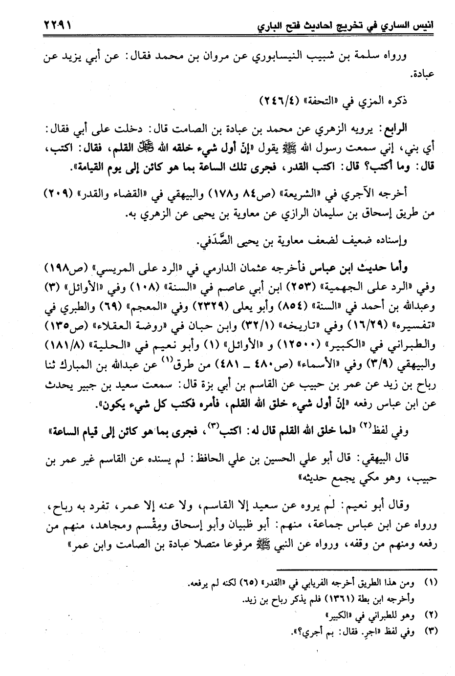 الرابع: يرويه الزهري عن محمد بن عبادة بن الصامت قال: دخلت على أبي فقال: أي بني، إني سمعت رسول الله - صلى الله عليه وسلم - يقول "إن أول شيء خلقه الله عز وجل القلم، فقال: اكتب، قال: وما أكتب؟ قال: اكتب القدر، فجرى تلك الساعة بما هو كائن إلى يوم القيامة".