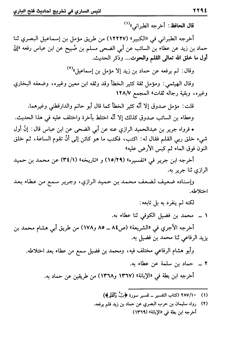 • فرواه جرير بن عبد الحميد الرازي عنه عن أبي الضحى عن ابن عباس قال: إنّ أول شيء خلق ربي القلم فقال له: اكتب، فكتب ما هو كائن إلى أنْ تقوم الساعة، ثم خلق النون فوق الماء ثم كبس الأرض عليه"