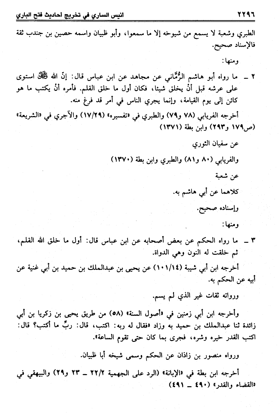 2 - ما رواه أبو هاشم الرُّمَّاني عن مجاهد عن ابن عباس قال: إن الله عز وجل استوى على عرشه قبل أنْ يخلق شيئا، فكان أولى ما خلق القلم. فأمره أنْ يكتب ما هو كائن إلى يوم القيامة، وإنما يجري الناس في أمر قد فرغ منه.