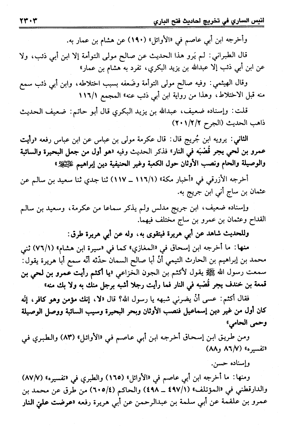 فقال أكثم: عسى أنْ يضرني شبهه يا رسول الله؟ قال "لا، إنك مؤمن وهو كافر، إنّه كان أول من غير دين إسماعيل فنصب الأوثان وبحر البحيرة وسيب السائبة ووصل الوصيلة وحمى الحامي"