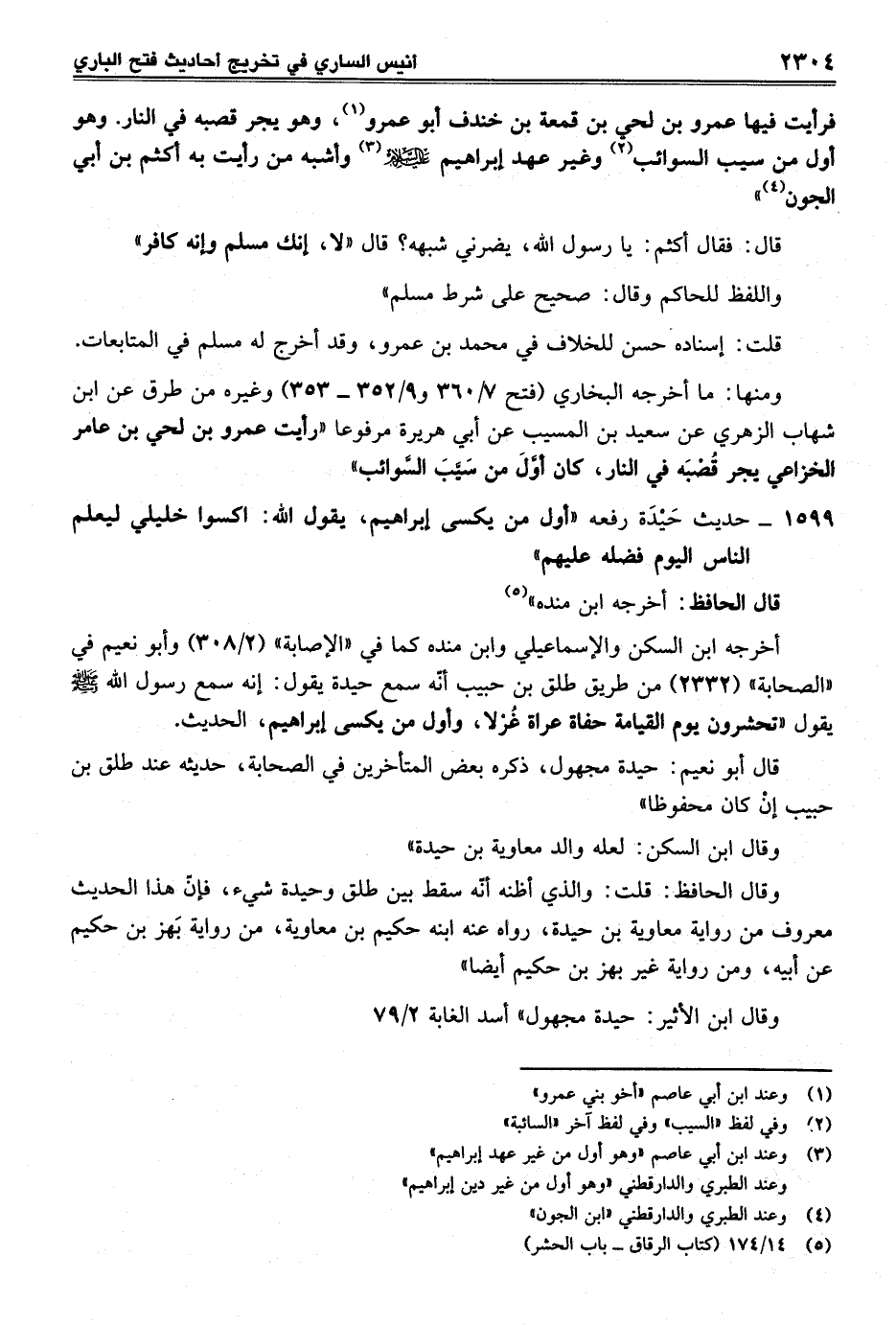 ومنها: ما أخرجه البخاري (فتح 7/ 360 و 9/ 352 - 353) وغيره من طرق عن ابن شهاب الزهري عن سعيد بن المسيب عن أبي هريرة مرفوعا "رأيت عمرو بن لحي بن عامر الخزاعي يجر قُصْبَه في النار، كان أوَّلَ من سَيَّبَ السَّوائب"