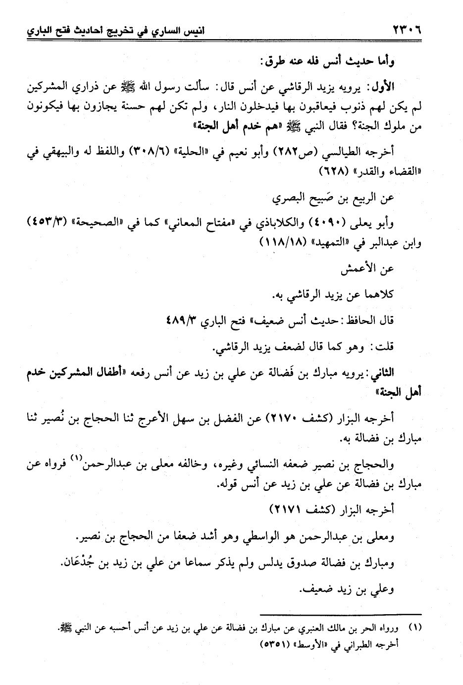 الأول: يرويه يزيد الرقاشي عن أنس قال: سألت رسول الله - صلى الله عليه وسلم - عن ذراري المشركين لم يكن لهم ذنوب فيعاقبون بها فيدخلون النار، ولم تكن لهم حسنة يجازون بها فيكونون من ملوك الجنة؟ فقال النبي - صلى الله عليه وسلم - "هم خدم أهل الجنة"