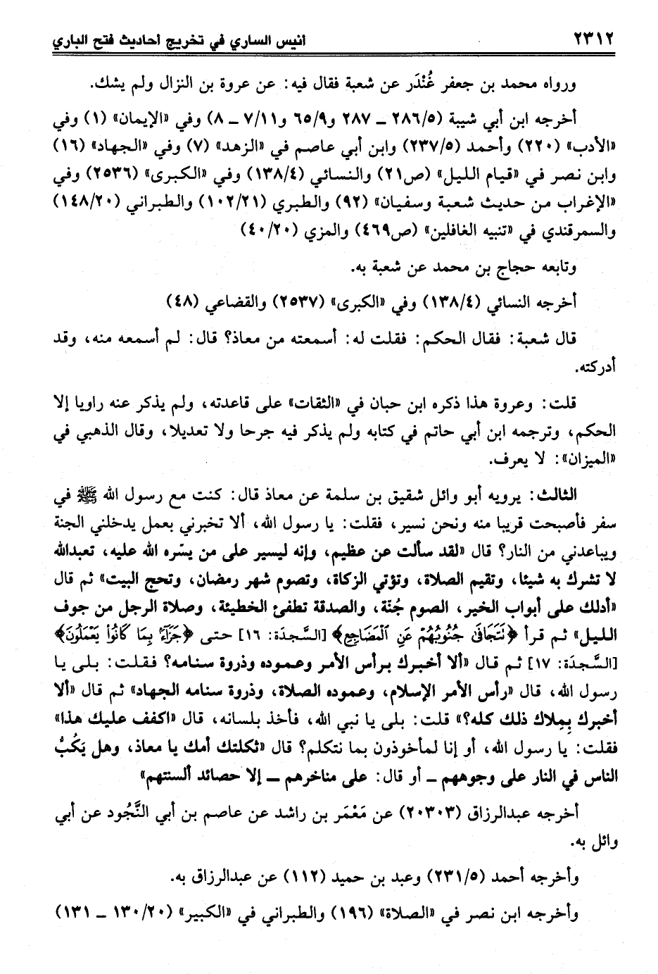 أخرجه ابن أبي شيبة (5/ 286 - 287 و 9/ 65 و11/ 7 - 8) وفي "الإيمان" (1) وفي "الأدب" (220) وأحمد (5/ 237) وابن أبي عاصم في "الزهد" (7) وفي "الجهاد" (16) وابن نصر في "قيام الليل" (ص 21) والنسائي (4/ 138) وفي "الكبرى" (2536) وفي "الإغراب من حديث شعبة وسفيان" (92) والطبري (21/ 102) والطبراني (20/ 148) والسمرقندي في "تنبيه الغافلين" (ص 469) والمزي (20/ 40)