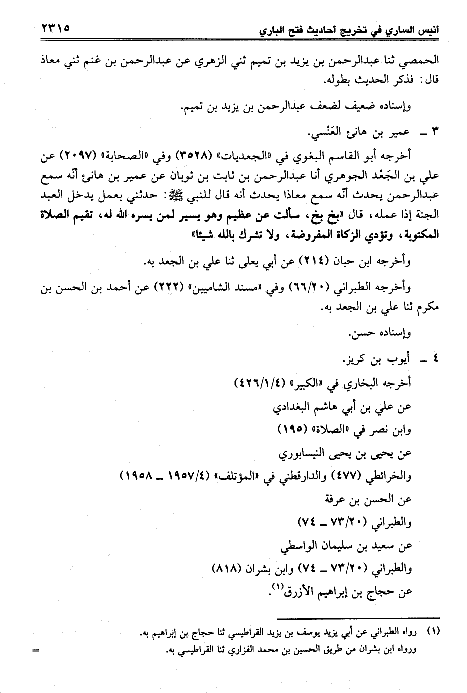 أخرجه أبو القاسم البغوي في "الجعديات" (3528) وفي "الصحابة" (2097) عن علي بن الجَعْد الجوهري أنا عبد الرحمن بن ثابت بن ثوبان عن عمير بن هانئ أنّه سمع عبد الرحمن يحدث أنّه سمع معاذا يحدث أنه قال للنبي - صلى الله عليه وسلم -: حدثني بعمل يدخل العبد الجنة إذا عمله، قال "بخ بخ، سألت عن عظيم وهو يسير لمن يسره الله له، تقيم الصلاة المكتوبة، وتؤدي الزكاة المفروضة، ولا تشرك بالله شيئا"