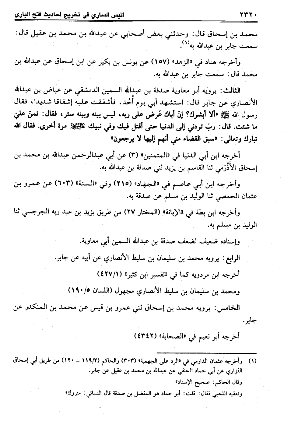 الثالث: يرويه أبو معاوية صدقة بن عبد الله السمين الدمشقي عن عياض بن عبد الله الأنصاري عن جابر قال: استشهد أبي يوم أُحُد، فأشفقت عليه إشفاقا شديدا، فقال رسول الله - صلى الله عليه وسلم - "ألا أبشرك؟ إنّ أباك عُرض على ربه، ليس بينه وبينه ستر، فقال: تمنّ عليّ ما شئت قال: ربّ تردني إلى الدنيا حتى أقتل فيك وفي نبيك عليه السلام مرة أخرى. فقال الله تبارك وتعالى: "سبق القضاء مني أنهم إليها لا يرجعون"