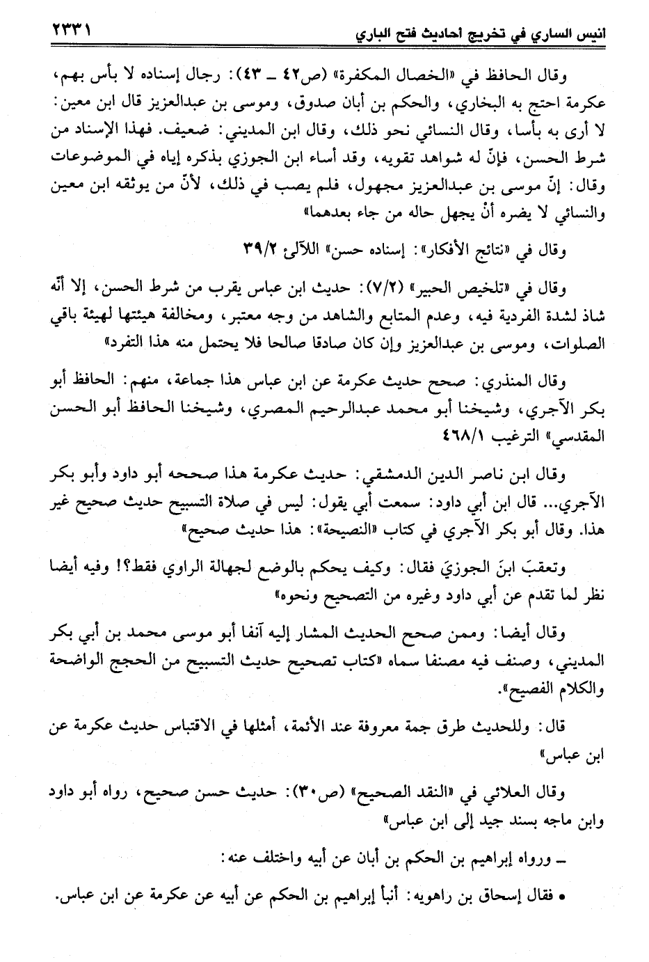 وقال الحافظ في "الخصال المكفرة" (ص 42 - 43): رجال إسناده لا بأس بهم، عكرمة احتج به البخاري، والحكم بن أبان صدوق، وموسى بن عبد العزيز قال ابن معين: لا أرى به بأسا، وقال النسائي نحو ذلك، وقال ابن المديني: ضعيف. فهذا الإسناد من شرط الحسن، فإن له شواهد تقويه، وقد أساء ابن الجوزي بذكره إياه في الموضوعات وقال: إنّ موسى بن عبد العزيز مجهول، فلم يصب في ذلك, لأنّ من يوثقه ابن معين والنسائي لا يضره أنْ يجهل حاله من جاء بعدهما"