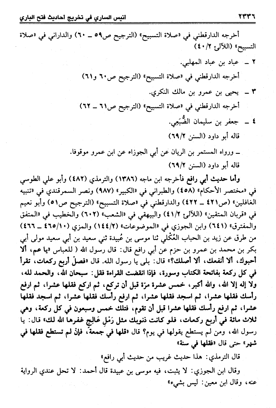 وأما حديث أبي رافع فأخرجه ابن ماجه (1386) والترمذي (482) وأبو علي الطوسي في "مختصر الأحكام" (458) والطبراني في "الكبير" (987) ونصر السمرقندي في "تنبيه الغافلين" (ص 421 - 422) والدارقطني في "صلاة التسبيح" (الترجيح ص 51) وأبو نعيم في "قربان المتقين" (اللآلئ 2/ 41) والبيهقي في "الشعب" (602) والخطيب في "المتفق والمفترق" (641) وابن الجوزي في "الموضوعات" (2/ 144) والمزي (10/ 465 - 466) من طرق عن زيد بن الحباب العُكْلي ثنا موسى بن عُبيدة ثني سعيد بن أبي سعيد مولى أبي بكر بن محمد بن عمرو بن حزم عن أبي رافع قال: قال رسول الله (للعباس "يا عم، ألا أحبوك، ألا أنفعك، ألا أصلك؟ " قال: بلى يا رسول الله. قال "فصلّ أربع ركعات، تقرأ في كل ركعة بفاتحة الكتاب وسورة، فإذا انقضت القراءة فقل: سبحان الله، والحمد لله، ولا إله إلا الله، والله أكبر، خمس عشرة مرة قبل أن تركع، ثم اركع فقلها عشرا، ثم ارفع رأسك فقلها عشرا، ثم اسجد فقلها عشرا، ثم ارفع رأسك فقلها عشرا، ثم اسجد فقلها عشرا، ثم ارفع رأسك فقلها عشرا قبل أن تقوم، فتلك خمس وسبعون في كل ركعة، وهي ثلاث مائة في أربع ركعات، فلو كانت ذنوبك مثل رَمْلِ عَالِجِ غفرها الله لك" قال: يا رسول الله، ومن لم يستطع يقولها في يوم؟ قال "قلها في جمعة، فإنْ لم تستطع فقلها في شهر" حتى قال "فقلها في سنة"