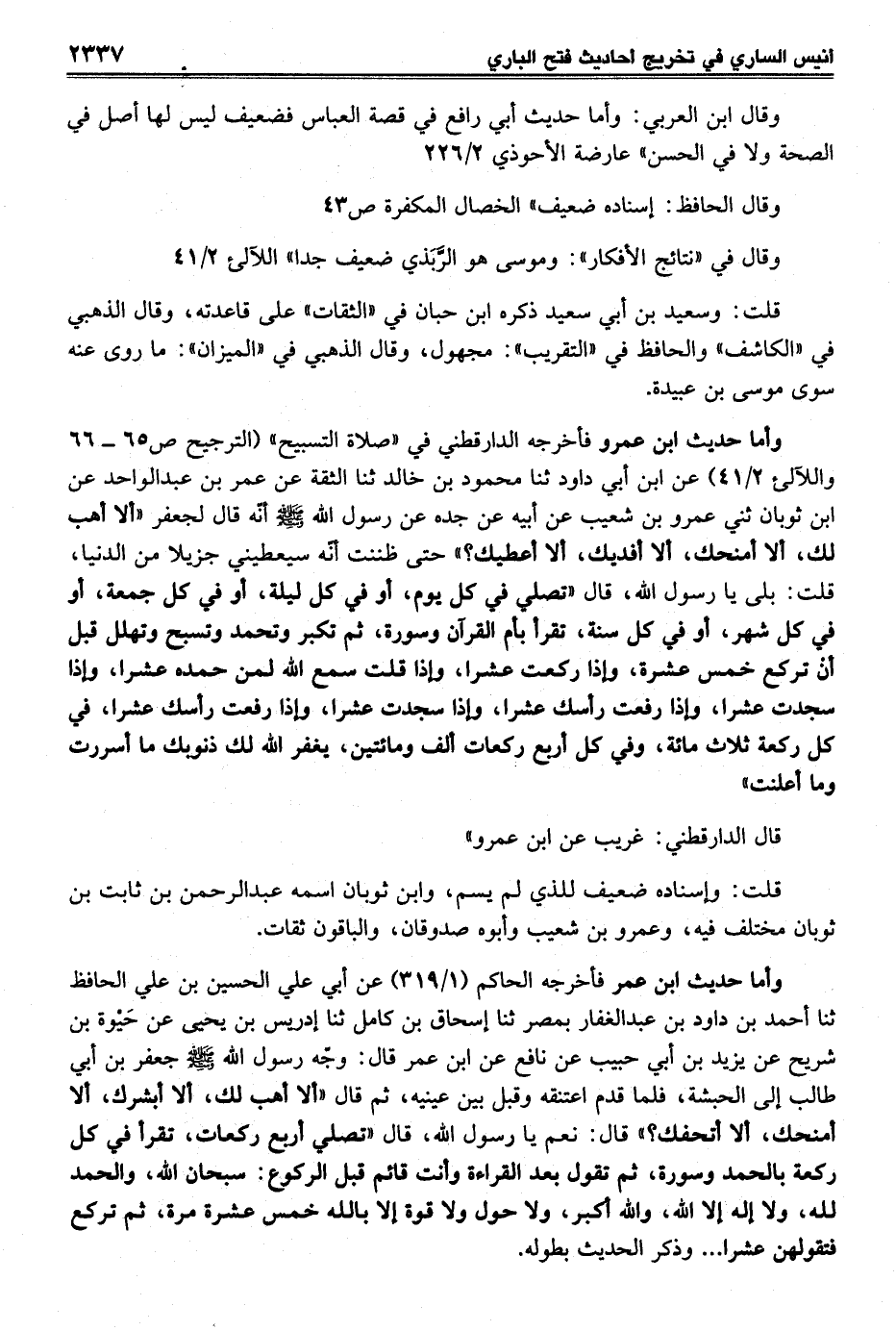 وأما حديث ابن عمرو فأخرجه الدارقطني في "صلاة التسبيح" (الترجيح ص 65 - 66 واللآلئ 2/ 41) عن ابن أبي داود ثنا محمود بن خالد ثنا الثقة عن عمر بن عبد الواحد عن ابن ثوبان ثني عمرو بن شعيب عن أبيه عن جده عن رسول الله - صلى الله عليه وسلم - أنّه قال لجعفر "ألا أهب لك، ألا أمنحك، ألا أفديك، ألا أعطيك؟ " حتى ظننت أنّه سيعطيني جزيلا من الدنيا، قلت: بلى يا رسول الله، قال "تصلي في كل يوم، أو في كل ليلة، أو في كل جمعة، أو في كل شهر، أو في كل سنة، تقرأ بأم القرآن سورة، ثم تكبر وتحمد وتسبح وتهلل قبل أنْ تركع خمس عشرة، وإذا ركعت عشرا، وإذا قلت سمع الله لمن حمده عشرا، وإذا سجدت عشرا، وإذا رفعت رأسك عشرا، وإذا سجدت عشرا، وإذا رفعت رأسك عشرا، في كل ركعة ثلاث مائة، وفي كل أربع ركعات ألف ومائتين، يغفر الله لك ذنوبك ما أسررت وما أعلنت"