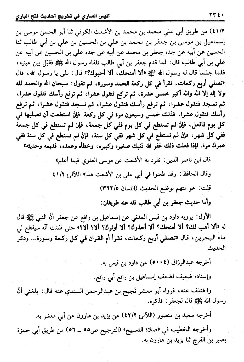 2/ 41) من طريق أبي علي محمد بن محمد بن الأشعث الكوفي ثنا أبو الحسن موسى بن إسماعيل بن موسى بن جعفر بن محمد بن علي بن الحسين بن علي بن أبي طالب ثنا الحسين عن أبيه عن جده جعفر بن محمد عن أبيه عن جده علي بن الحسين عن أبيه عن علي بن أبي طالب قال: لما قدم جعفر بن أبي طالب تلقاه رسول الله - صلى الله عليه وسلم - فقبّل بين عينيه، فلما جلسا قال له رسول الله - صلى الله عليه وسلم - "ألا أمنحك، ألا أحبوك؟ " قال: بلى يا رسول الله، قال "تصلي أربع ركعات، تقرأ في كل ركعة الحمد وسورة، ثم تقول: سبحان الله والحمد لله ولا إله إلا اله والله أكبر خمس عشرة، ثم تركع فتقول عشرا، ثم ترفع رأسك فتقول عشرا، ثم تسجد فتقول عشرا، ثم ترفع رأسك فتقول عشرا، ثم تسجد فتقول عشرا، ثم ترفع رأسك فتقول عشرا، فذلك خمس وسبعون مرة في كل ركعة. فإن استطعت أن تصليها في كل يوم فافعل، فإنْ لم تستطع في كل يوم ففي كل جمعة، فإن لم تستطع في كل جمعة ففي كل شهر، فإنْ لم تستطع في كل شهر ففي كل سنة، فإن لم تستطع في كل سنة ففي عمرك مرة فإذا فعلت ذلك غفر الله ذنبك صغيره وكبيره، وخطأه وعمده، قديمه وحديثه"