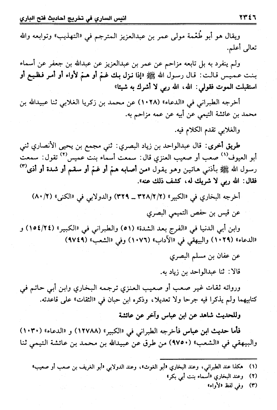 ولم ينفرد به بل تابعه مزاحم عن عمر بن عبد العزيز عن عبد الله بن جعفر عن أسماء بنت عميس قالت: قال رسول الله - صلى الله عليه وسلم - "إذا نزل بك غمّ أو همّ لأواء أو أمر فظيع أو استقبلت الموت فقولي: الله، الله ربي لا أشرك به شيئا"