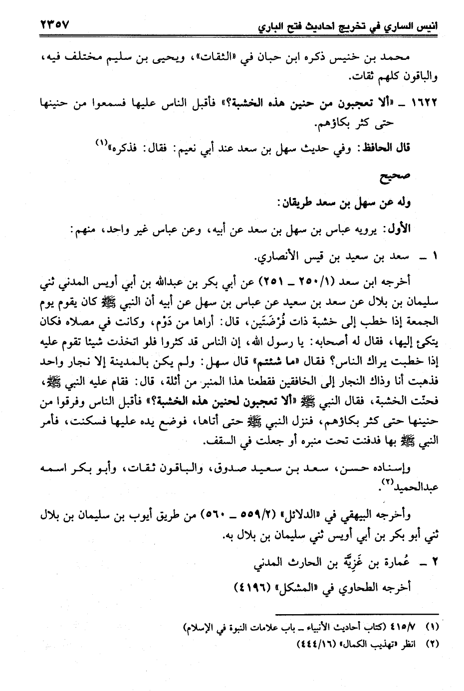 1622 - "ألا تعجبون من حنين هذه الخشبة؟ " فأقبل الناس عليها فسمعوا من حنينها حتى كثر بكاؤهم.