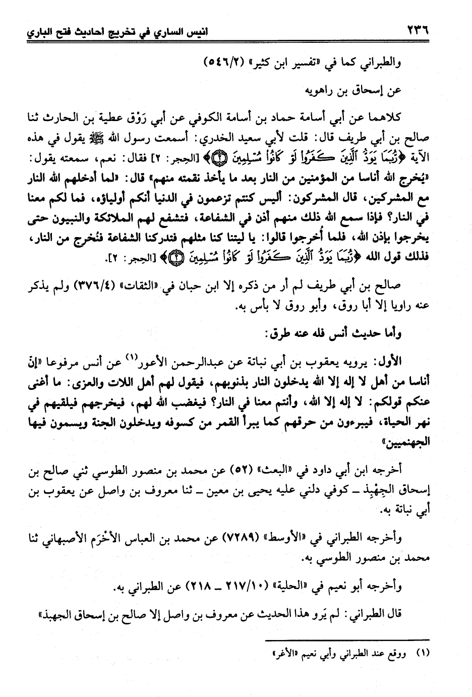 كلاهما عن أبي أسامة حماد بن أسامة الكوفي عن أبي رَوْق عطية بن الحارث ثنا صالح بن أبي طريف قال: قلت لأبي سعيد الخدري: أسمعت رسول الله -صلى الله عليه وسلم- يقول في هذه الآية {رُبَمَا يَوَدُّ الَّذِينَ كَفَرُوا لَوْ كَانُوا مُسْلِمِينَ (2)} [الحِجر: 2]، فقال: نعم، سمعته يقول: "يُخرج الله أناسا من المؤمنين من النار بعد ما يأخذ نقمته منهم" قال: "لما أدخلهم الله النار مع المشركين، قال المشركون: أليس كنتم تزعمون في الدنيا أنكم أولياؤه، فما لكم معنا في النار؟ فإذا سمع الله ذلك منهم أذن في الشفاعة، فتشفع لهم الملائكة والنبيون حتى يخرجوا بإذن الله، فلما أُخرجوا قالوا: يا ليتنا كنا مثلهم فتدركنا الشفاعة فنُخرج من النار، فذلك قول الله {رُبَمَا يَوَدُّ الَّذِينَ كَفَرُوا لَوْ كَانُوا مُسْلِمِينَ (2)} [الحِجر: 2].