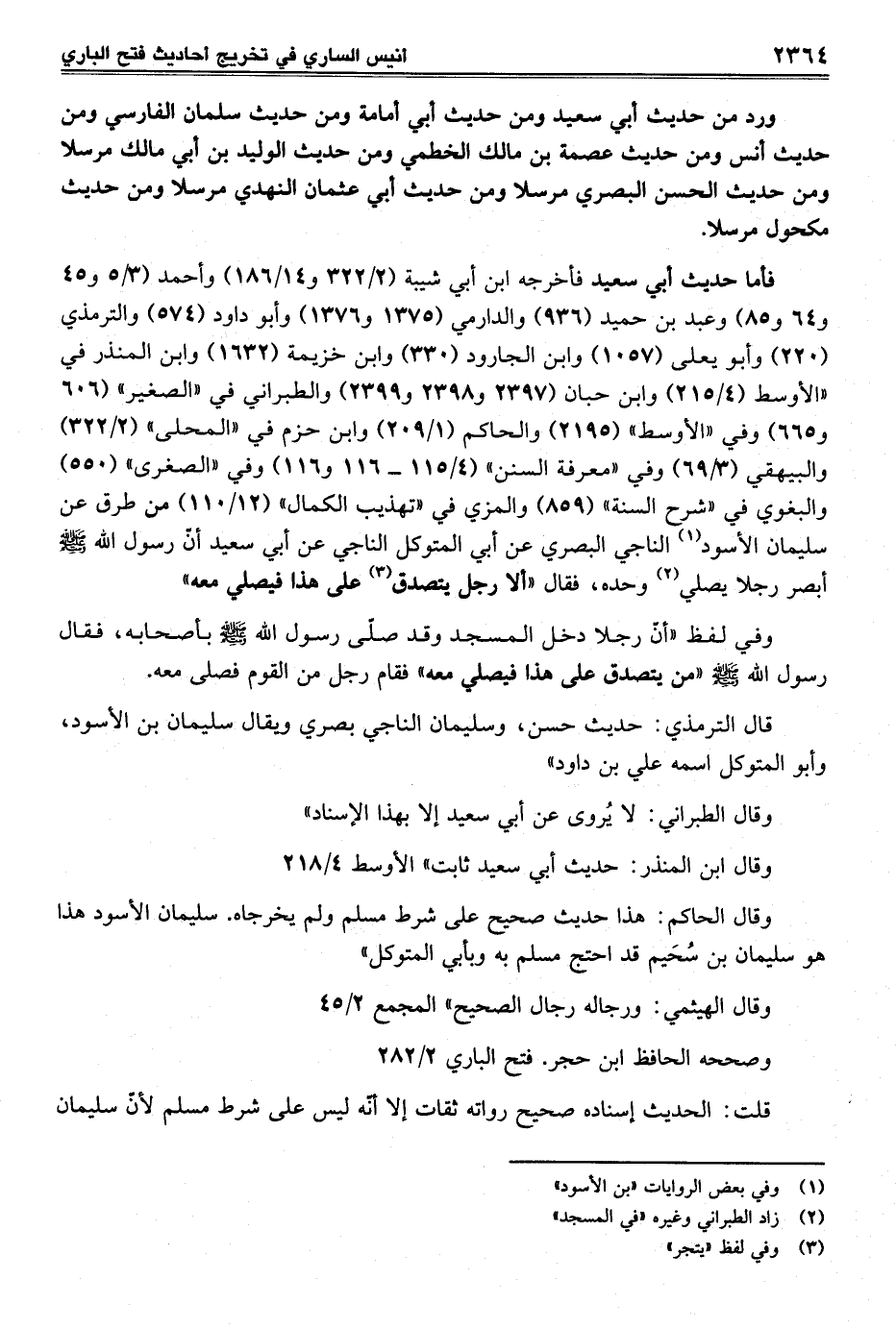 فأما حديث أبي سعيد فأخرجه ابن أبي شيبة (2/ 322 و 14/ 186) وأحمد (3/ 5 و45 و 64 و 85) وعبد بن حميد (936) والدارمي (1375 و 1376) وأبو داود (574) والترمذي (220) وأبو يعلى (1057) وابن الجارود (330) وابن خزيمة (1632) وابن المنذر في "الأوسط (4/ 215) وابن حبان (2397 و 2398 و 2399) والطبراني في "الصغير" (606 و665) وفي "الأوسط" (2195) والحاكم (1/ 209) وابن حزم في "المحلى" (2/ 322) والبيهقي (3/ 69) وفي "معرفة السنن" (4/ 115 - 116 و 116) وفي "الصغرى" (550) والبغوي في "شرح السنة" (859) والمزي في "تهذيب الكمال" (12/ 110) من طرق عن سليمان الأسود (¬1) الناجي البصري عن أبي المتوكل الناجي عن أبي سعيد أنّ رسول الله - صلى الله عليه وسلم - أبصر رجلا يصلي (¬2) وحده، فقال "ألا رجل يتصدق (¬3) على هذا فيصلي معه"