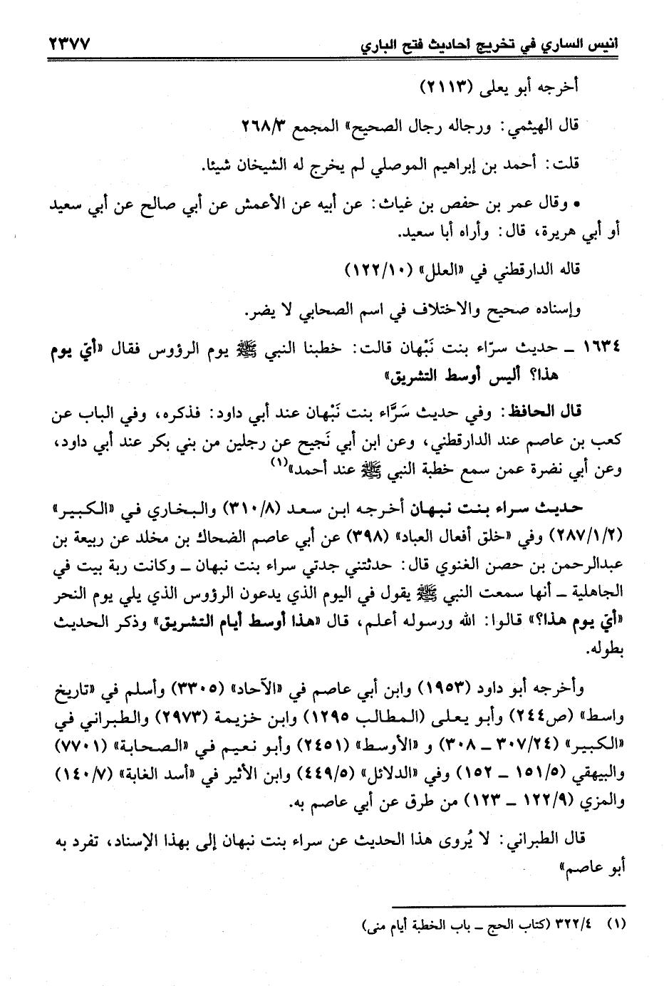 حديث سراء بنت نبهان أخرجه ابن سعد (8/ 310) والبخاري في "الكبير" (2/ 1/ 287) وفي "خلق أفعال العباد" (398) عن أبي عاصم الضحاك بن مخلد عن ربيعة بن عبد الرحمن بن حصن الغنوي قال: حدثتني جدتي سراء بنت نبهان- وكانت ربة بيت في الجاهلية- أنها سمعت النبي - صلى الله عليه وسلم - يقول في اليوم الذي يدعون الرؤوس الذي يلي يوم النحر "أيّ يوم هذا؟ " قالوا: الله ورسوله أعلم، قال "هذا أوسط أيام التشريق" وذكر الحديث بطوله.